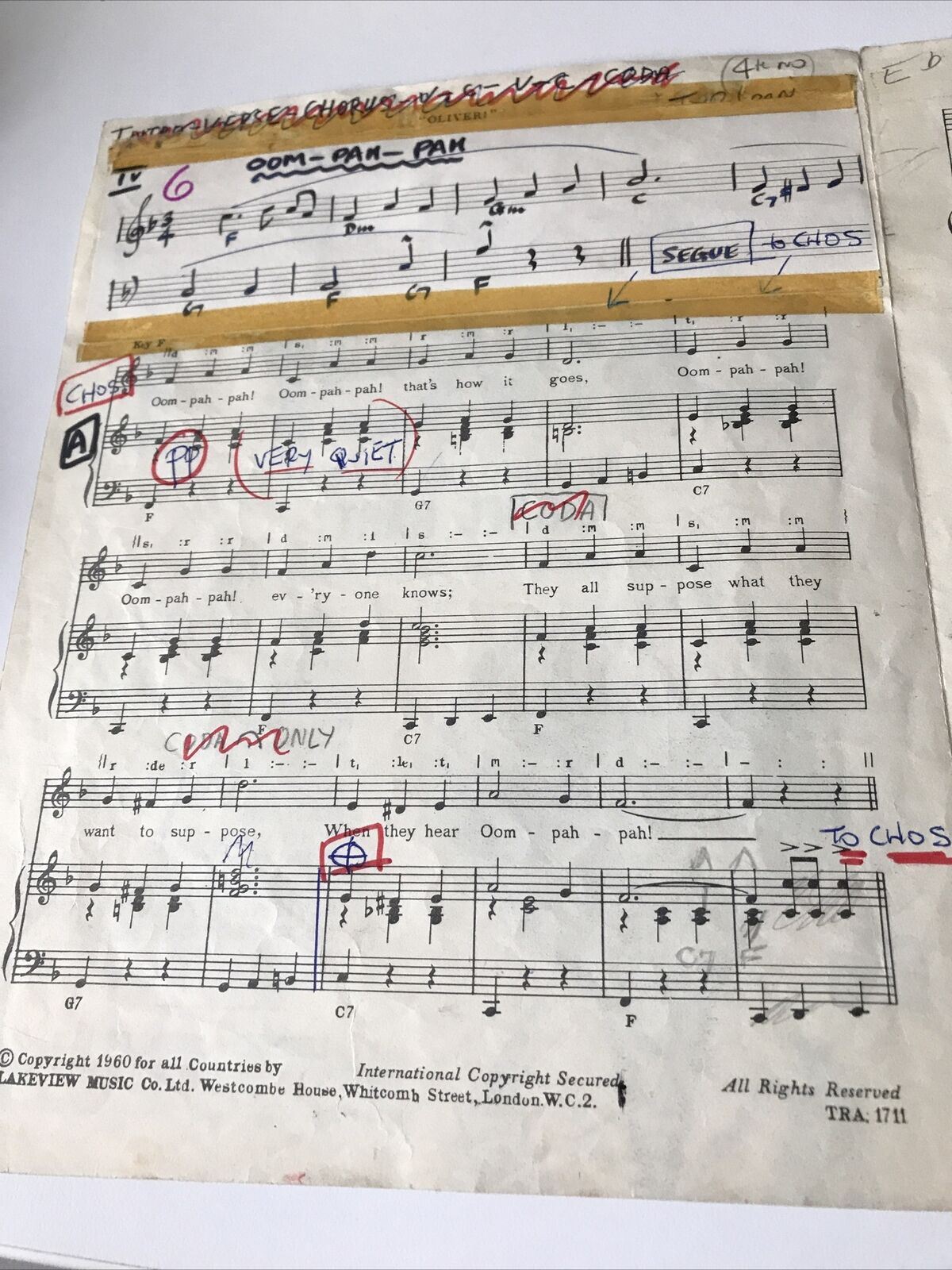 OOM-PAH-PAH! From OLIVER! Vintage Sheet Music 1960 Lionel Bart Anotated Repaired