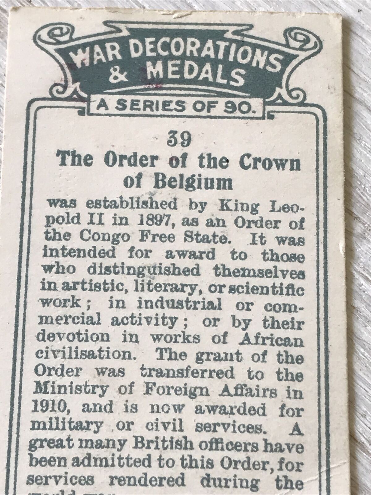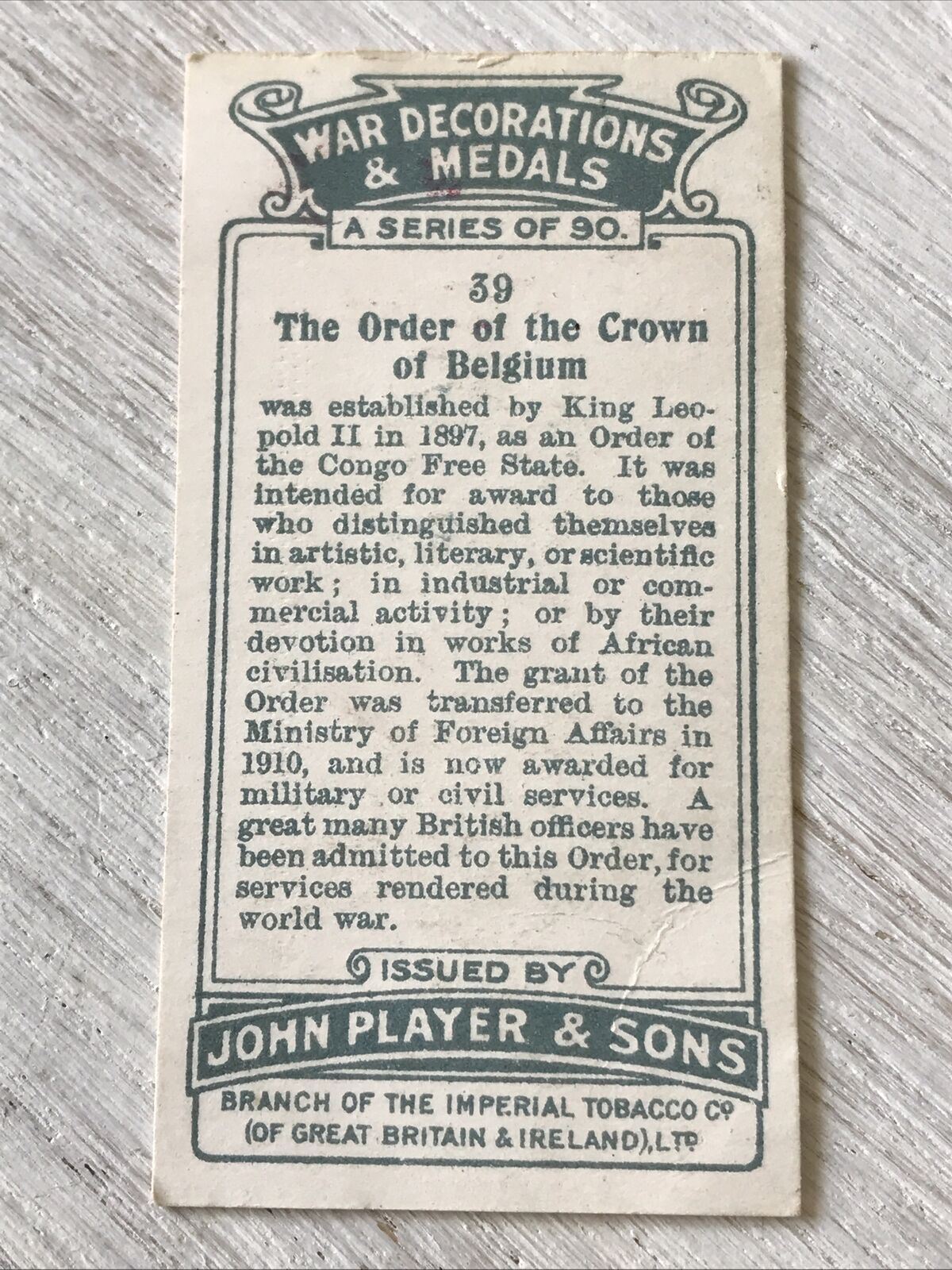 ORDER OF THE CROWN OF BELGIUM Players Cig Card War Decorations & Medals No 39