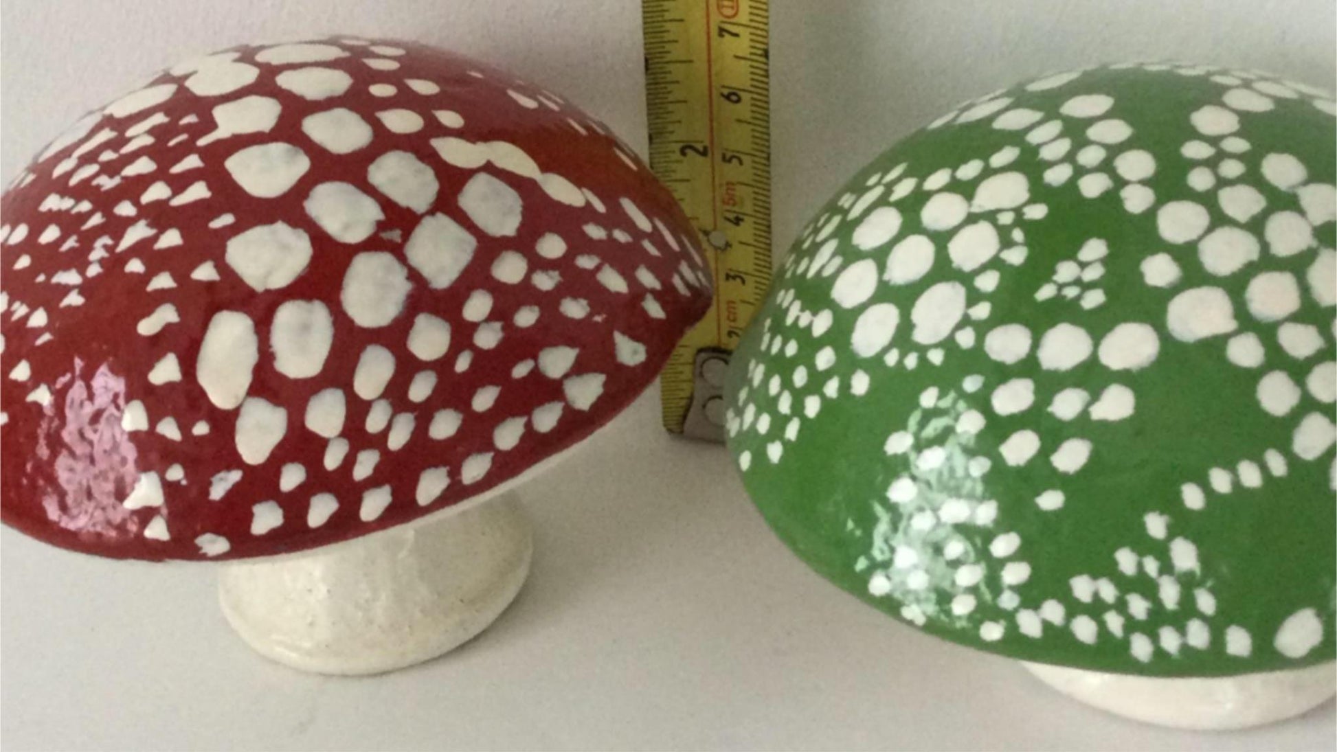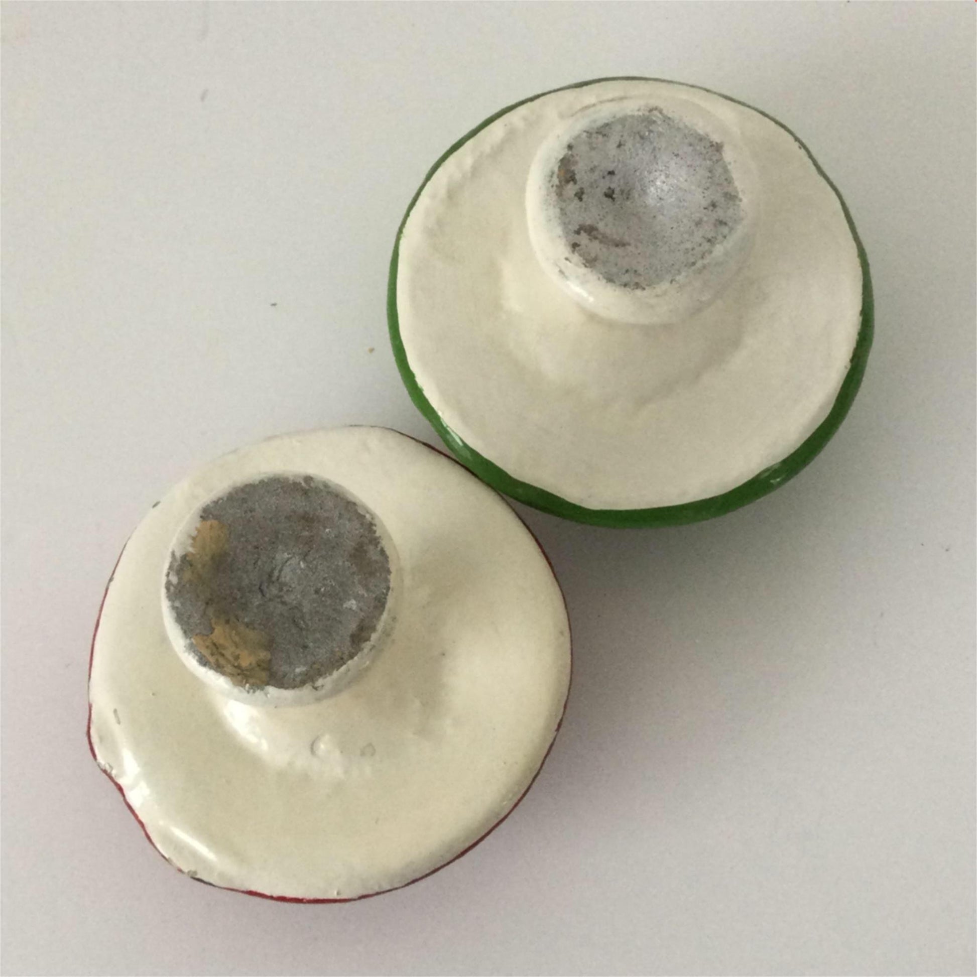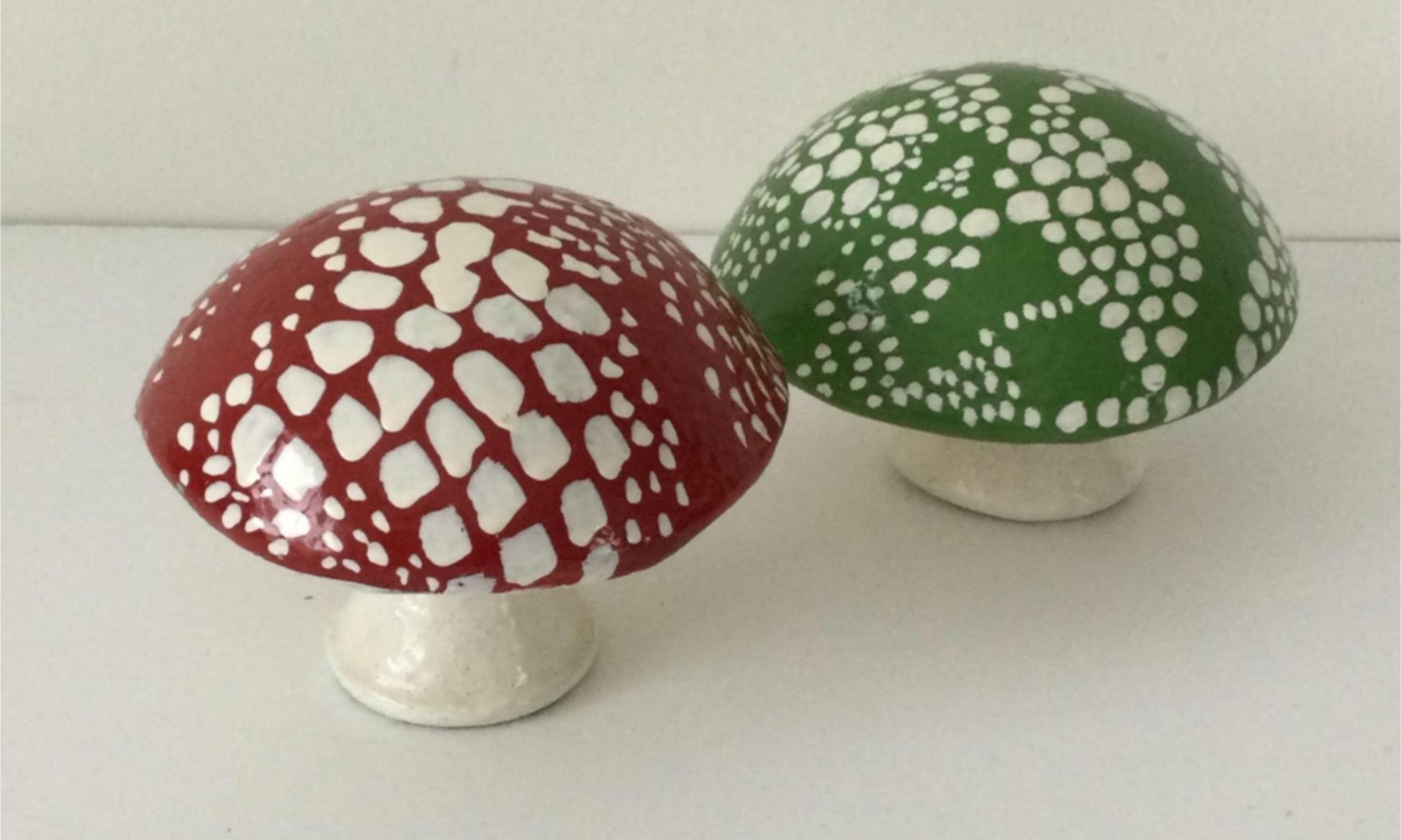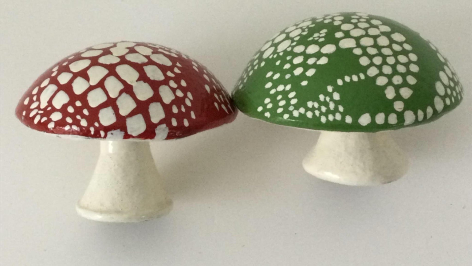 Pair of 2 heavy ornamental toadstools small green red hand painted 8.5 Cm