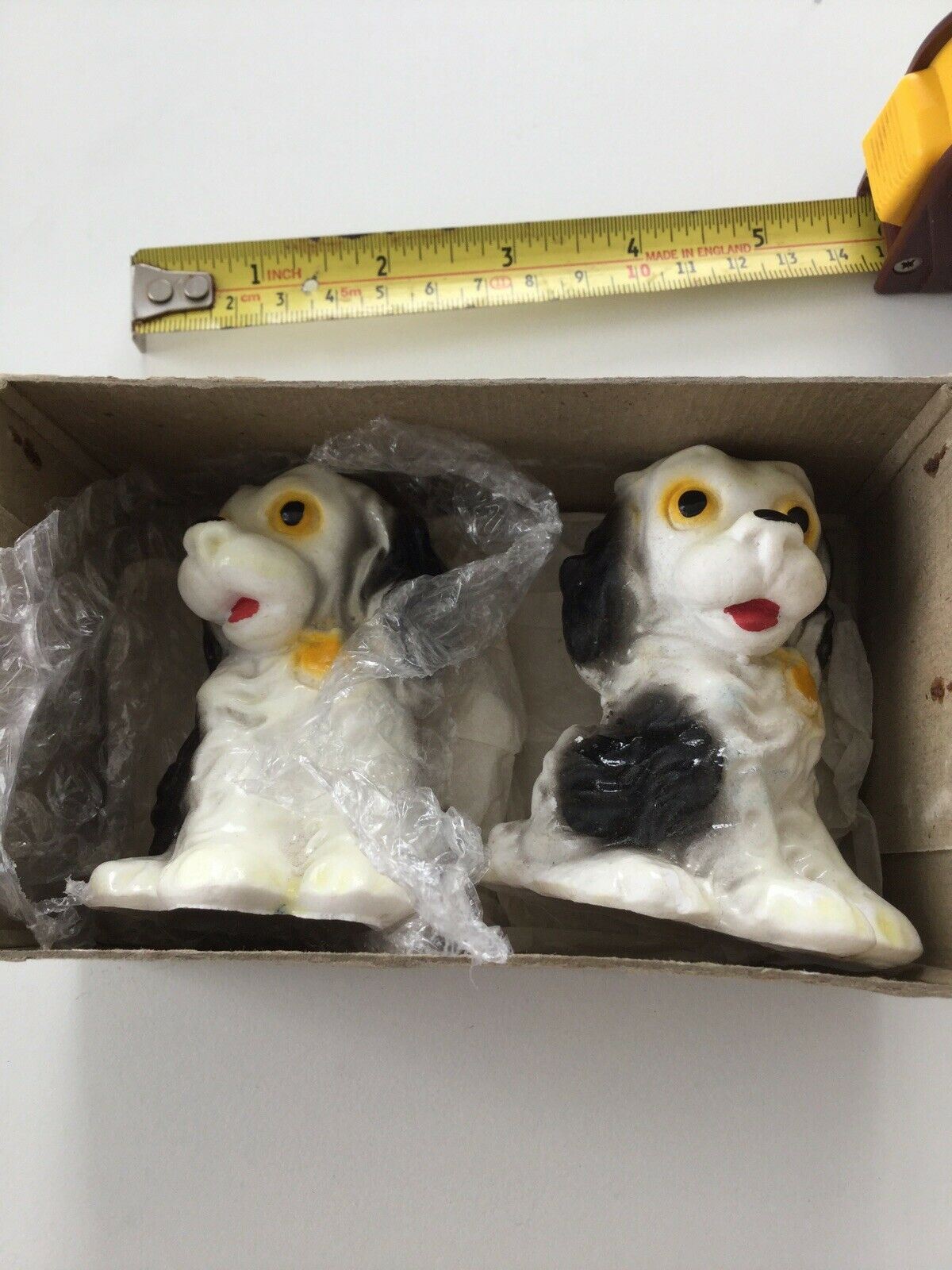 Pair Of Vintage Spaniel Dog Ornaments. Black And White. Ceramic. 1960s? Boxed