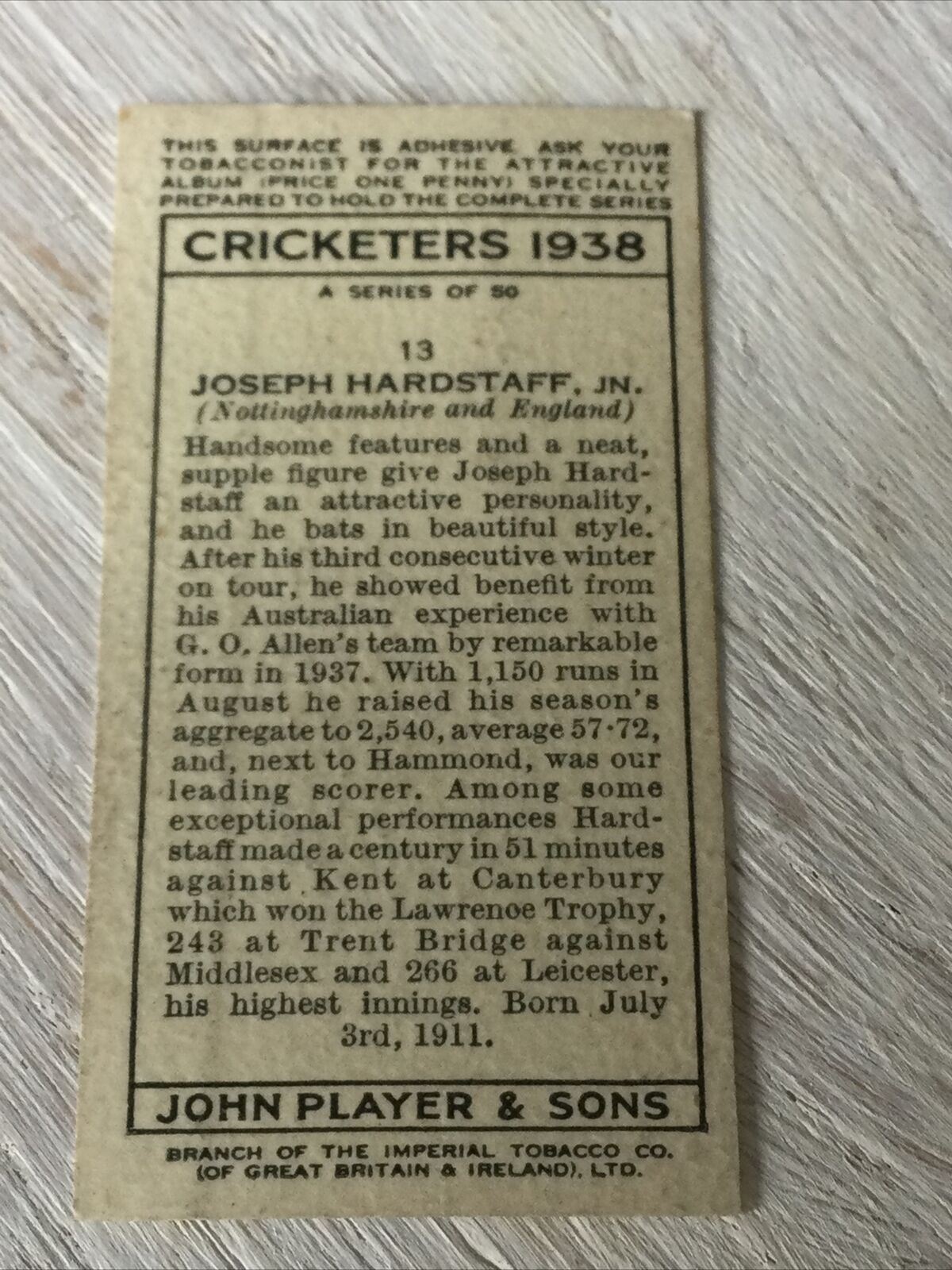 PLAYER'S Cigarette Card Cricketers 1938 13 Joseph Hardstaff Nottinghamshire Engl