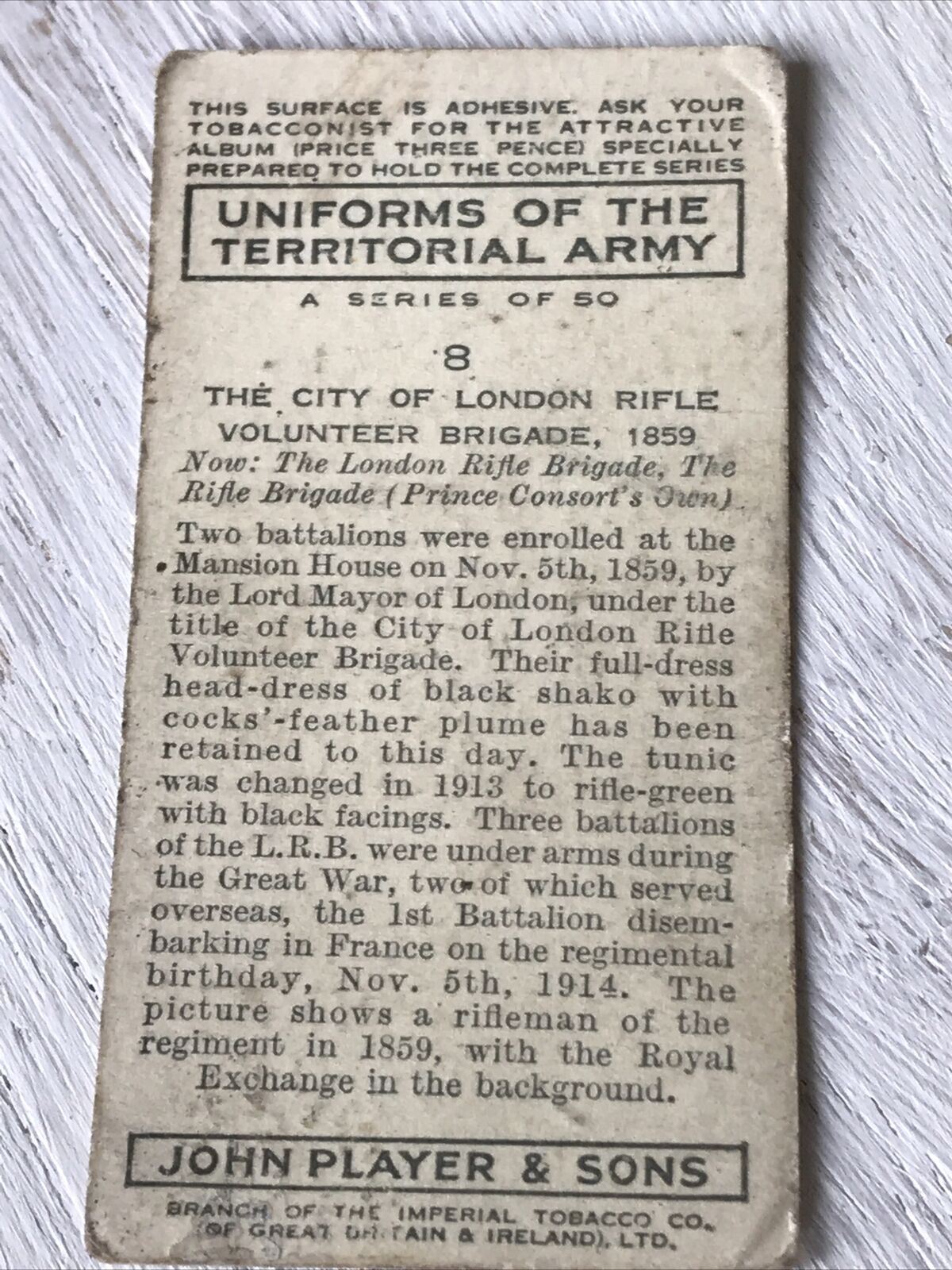 Players Cigarette Card - Uniforms Of The Territorial Army - No. 8 City Of London Rifle Volunteer Brigade