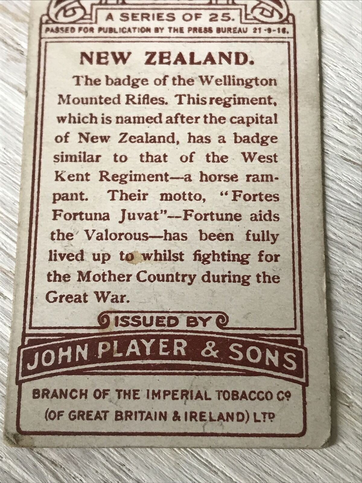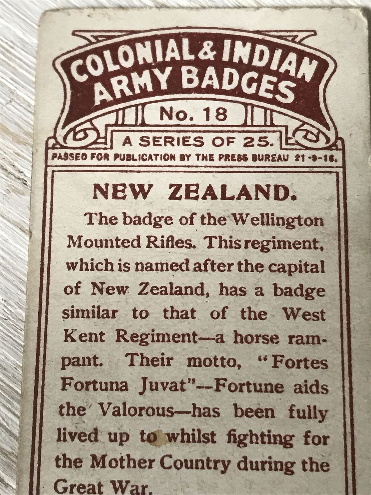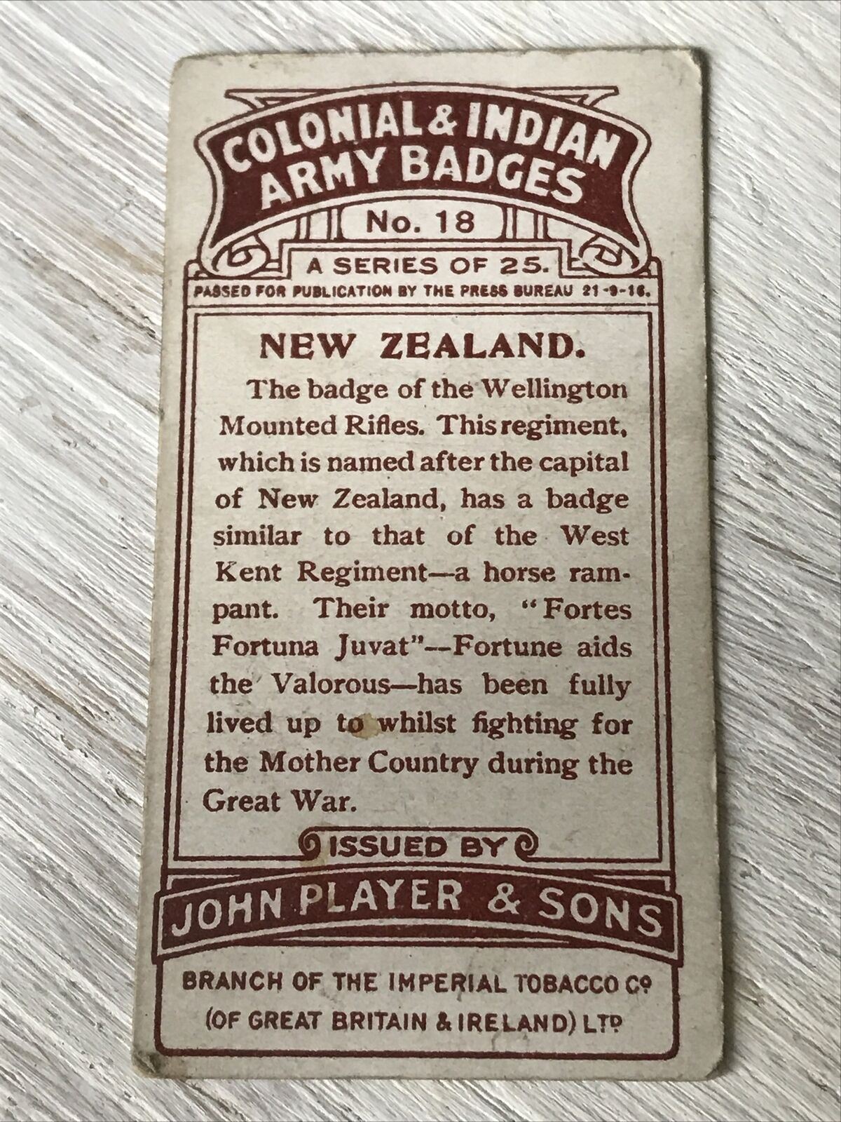 Players Cigarettes Card - Colonial & Indian Army Badges - No. 18 New Zealand - Wellington Mounted Rifles