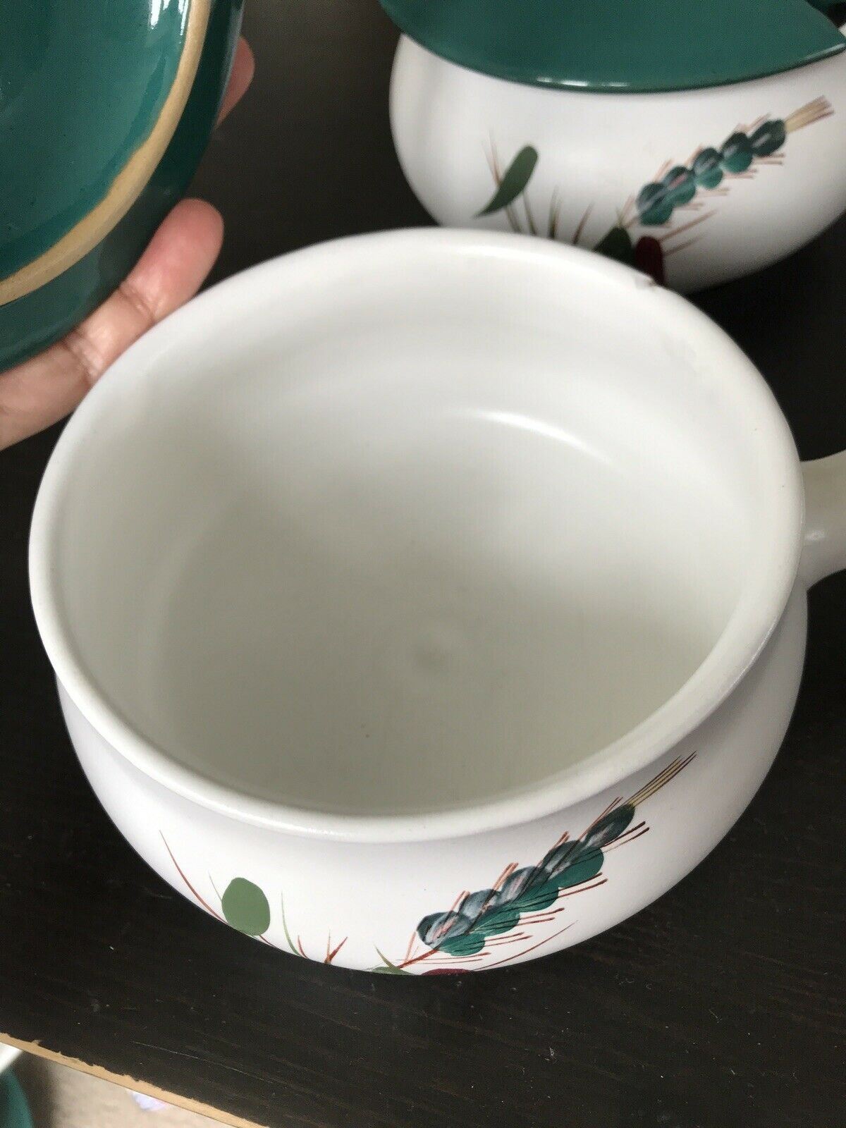 Due to the longevity of production there is a huge variety of pieces to collect with minor variations in design over the years. It features a wheat sheaf hand-painted design on a white "egg-shell" glazed base, with complimentary high glazed green lids, saucers and bases. Some pieces also came with teak stands.