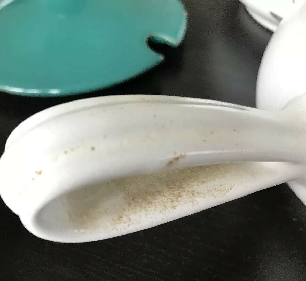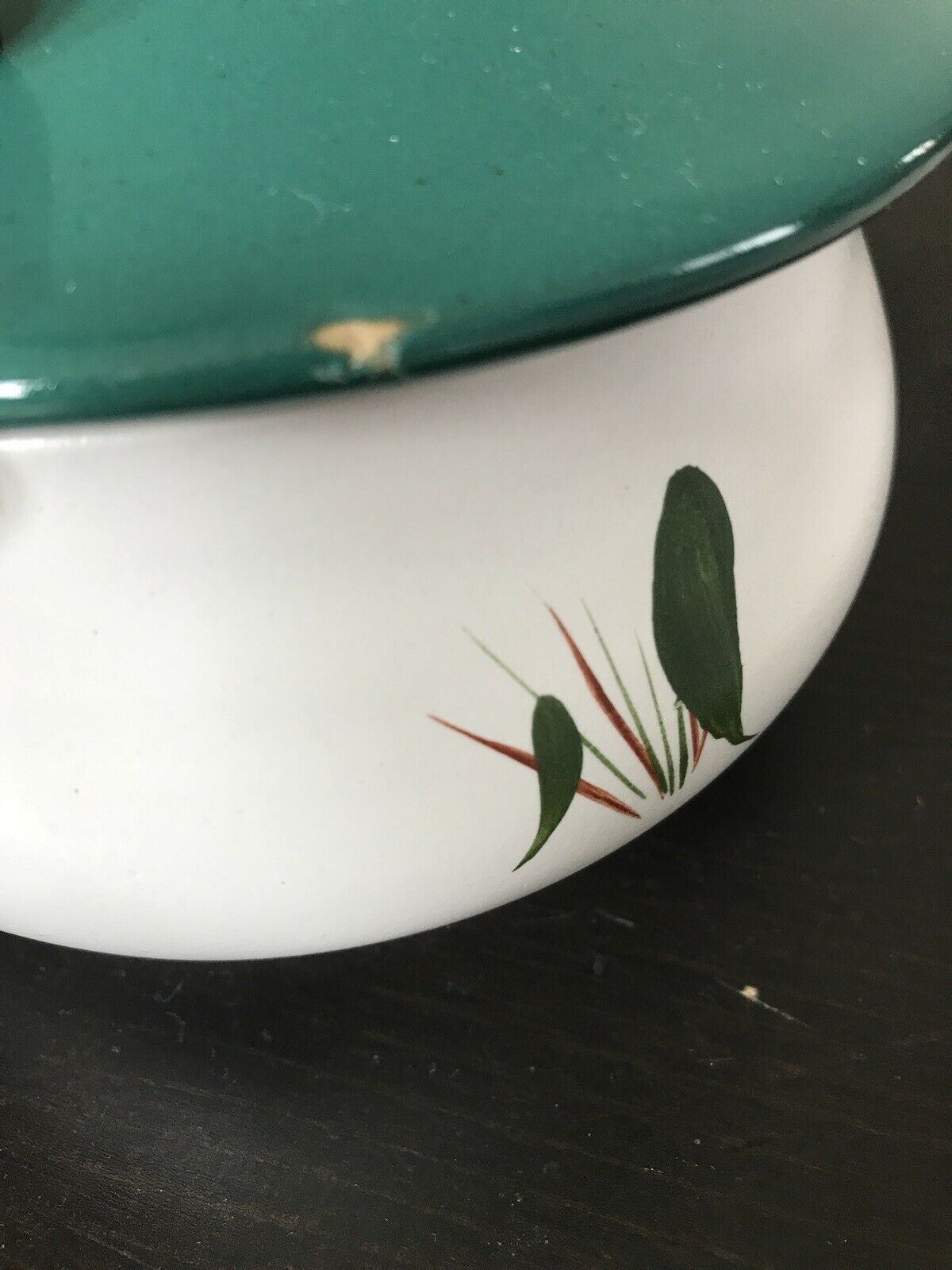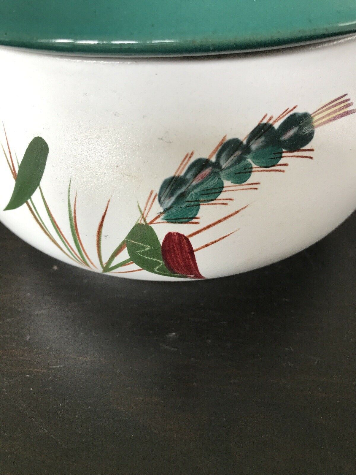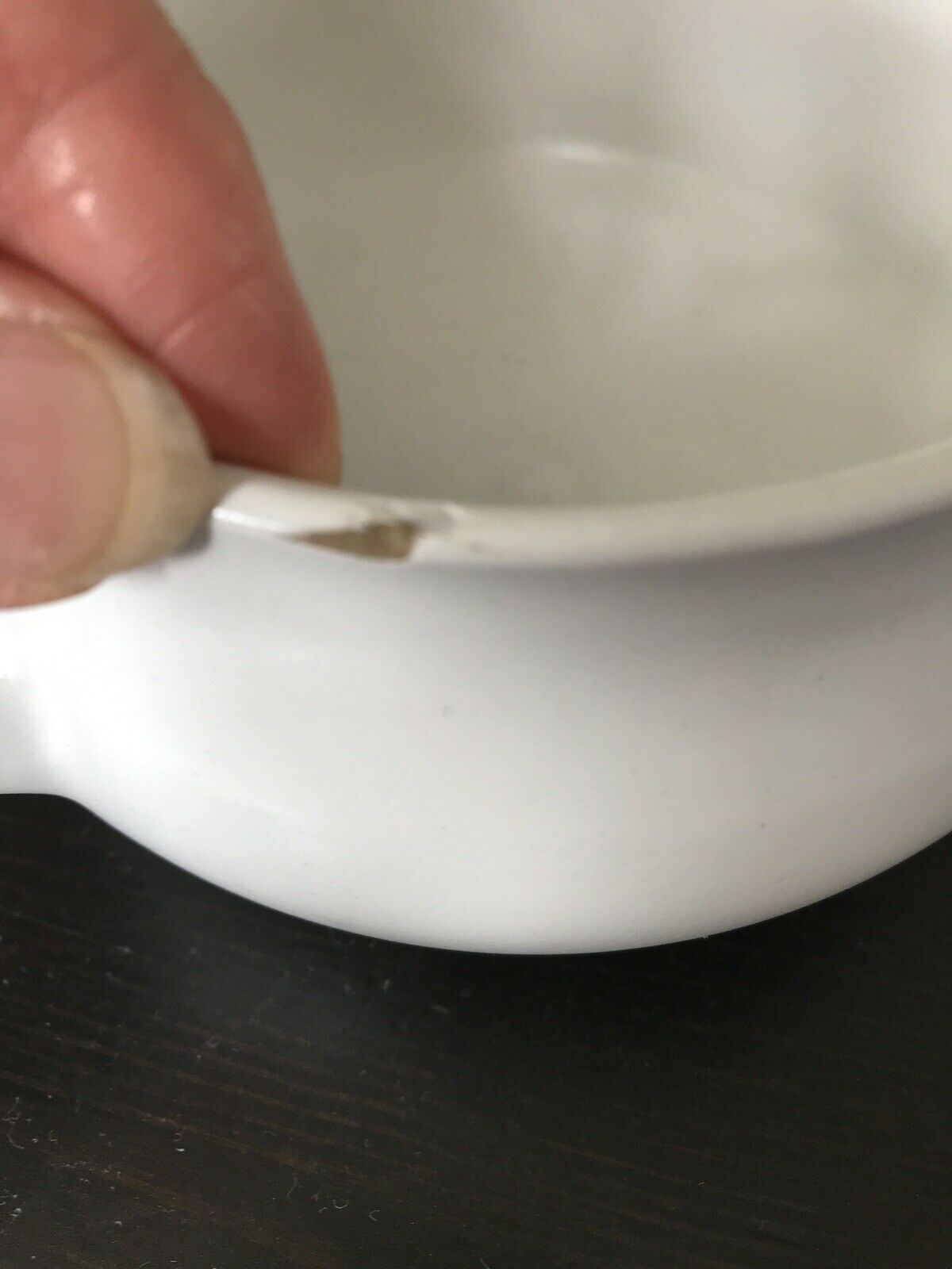 There are some marks to the handles, and a chip to one of the lids and one of the bowls. Please see photos.