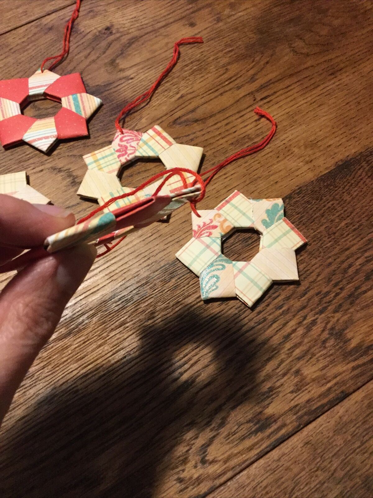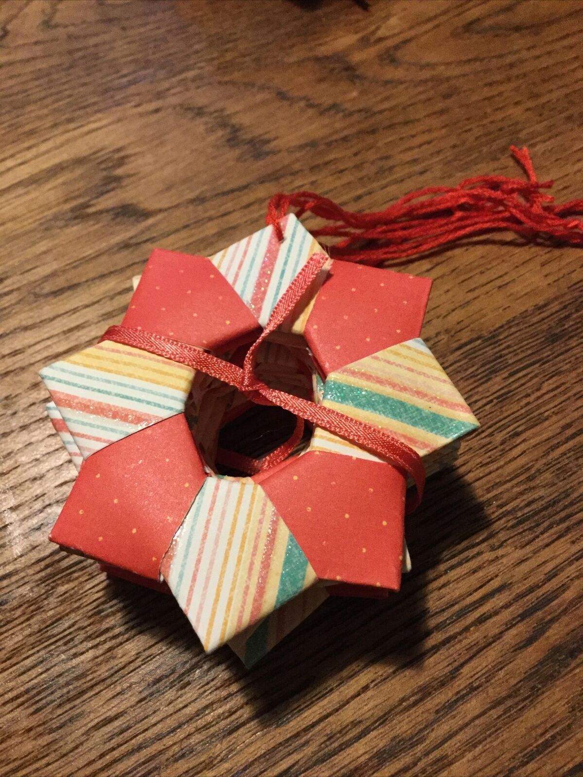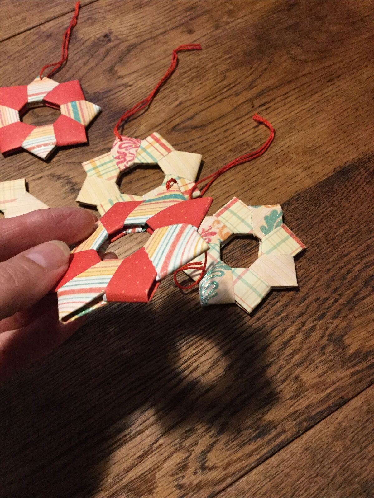 Set Of 5 Handmade Origami Star Tree Decorations. Baubles. Hanging. Orange Green