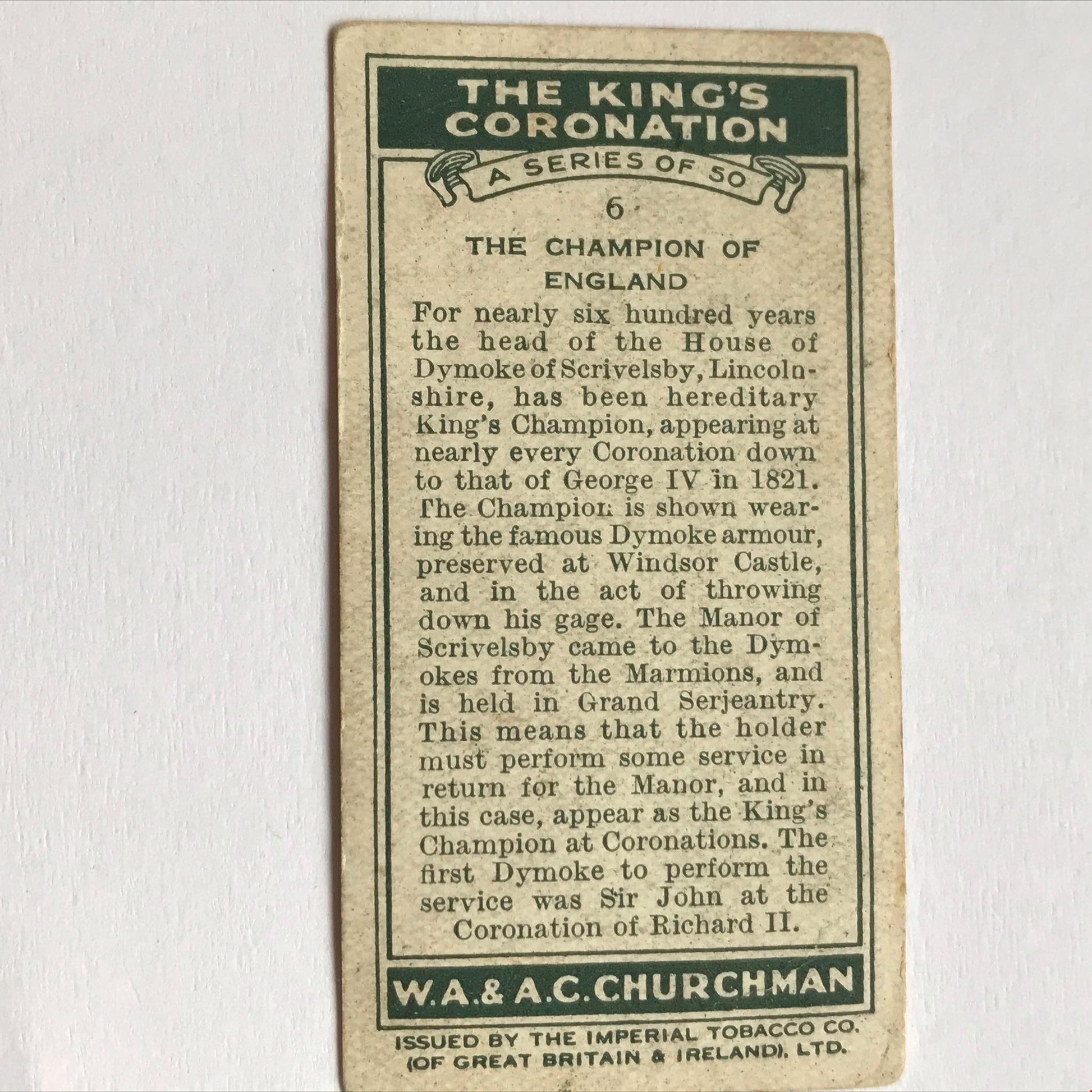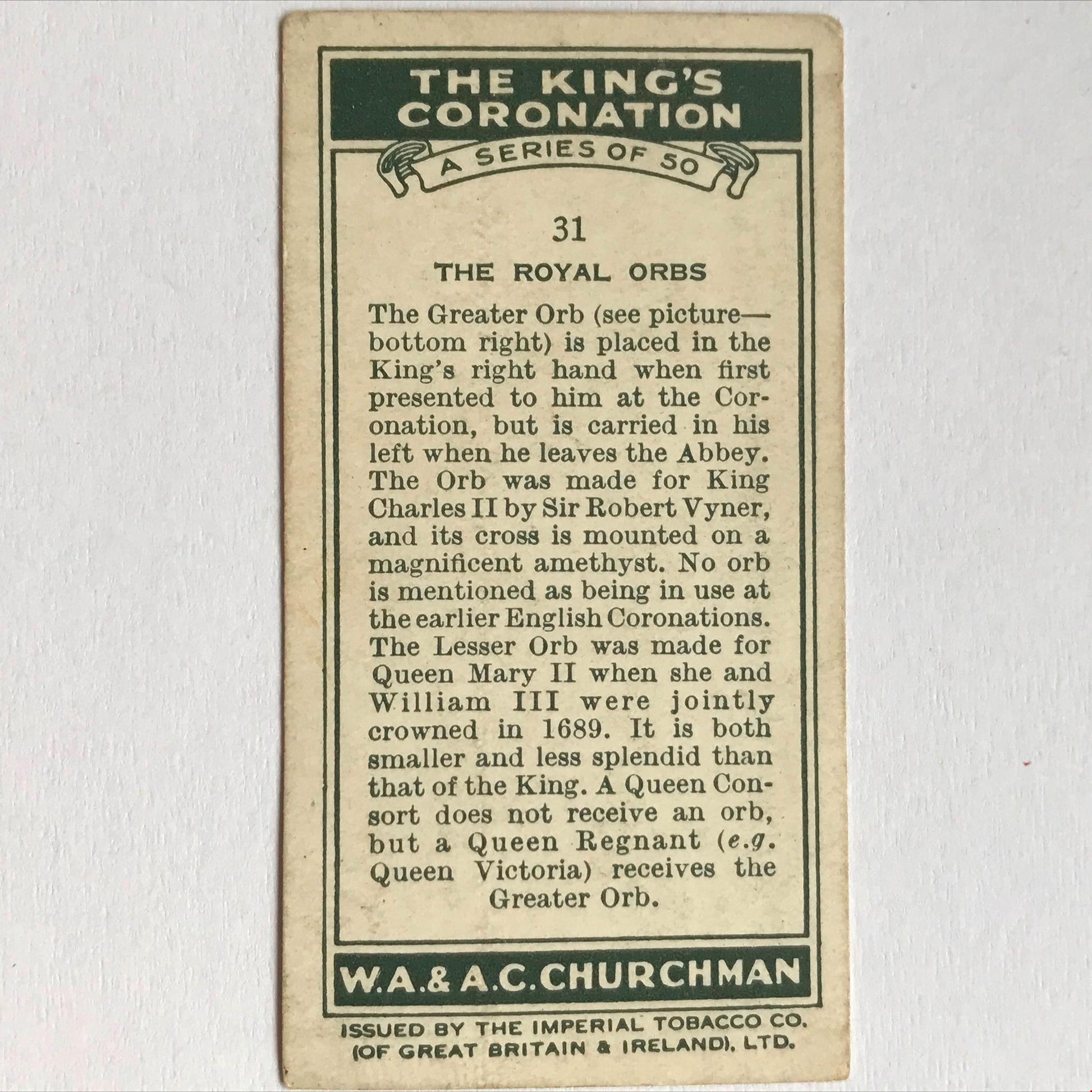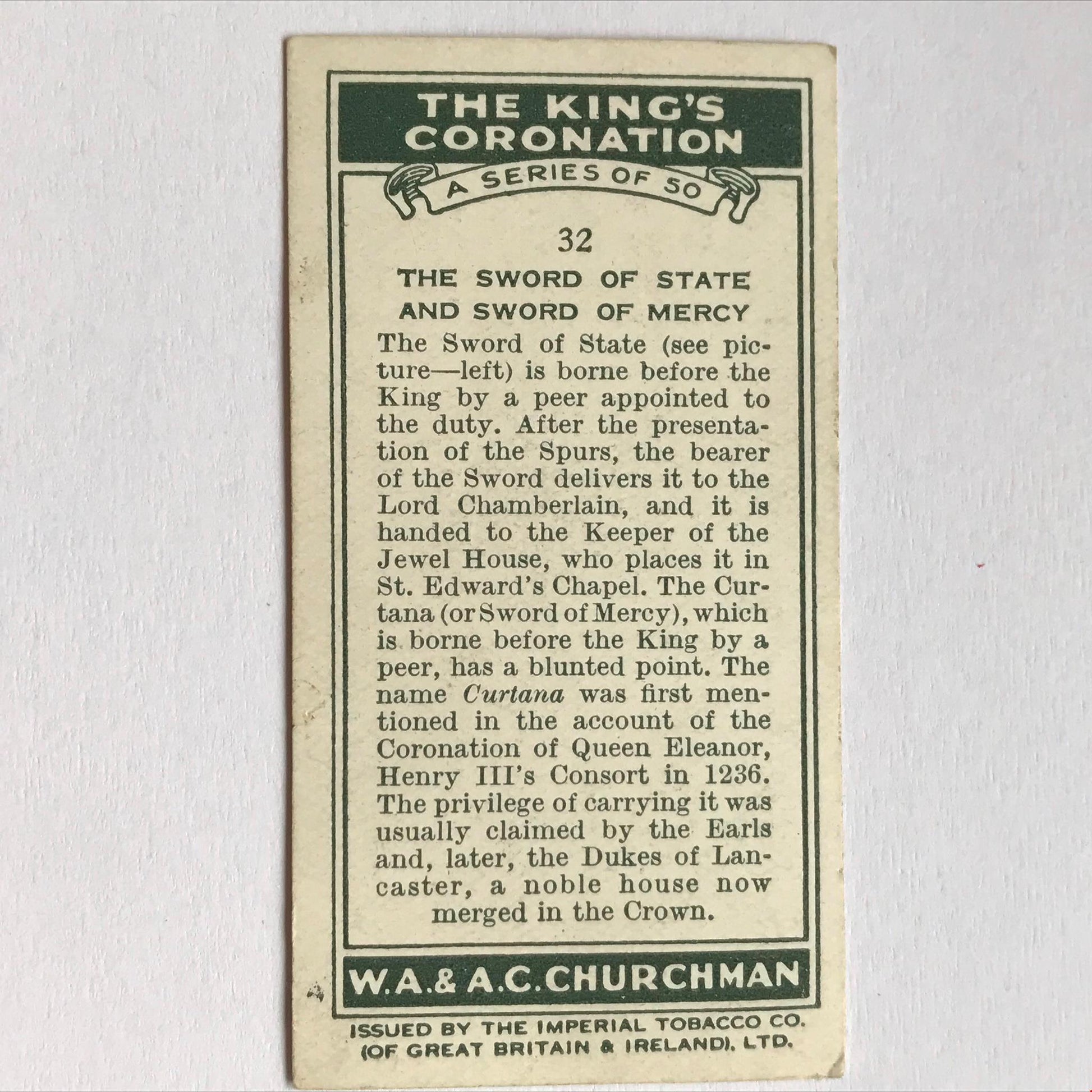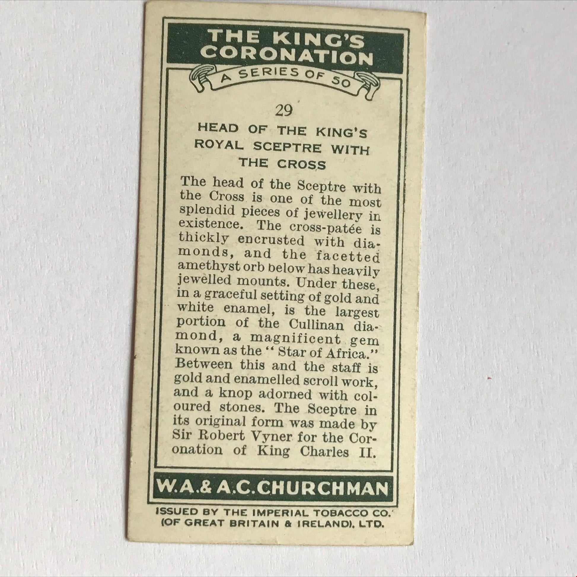 In 1937, W.A. & A.C. Churchman, a prominent British tobacco company, released a series of 50 cigarette cards titled "The King's Coronation" to commemorate the crowning of King George VI. Each card in this collection features detailed illustrations related to the coronation ceremony, providing insights into the event's significance and the traditions of the British monarchy. The reverse side of each card offers informative descriptions, enhancing their educational value.
