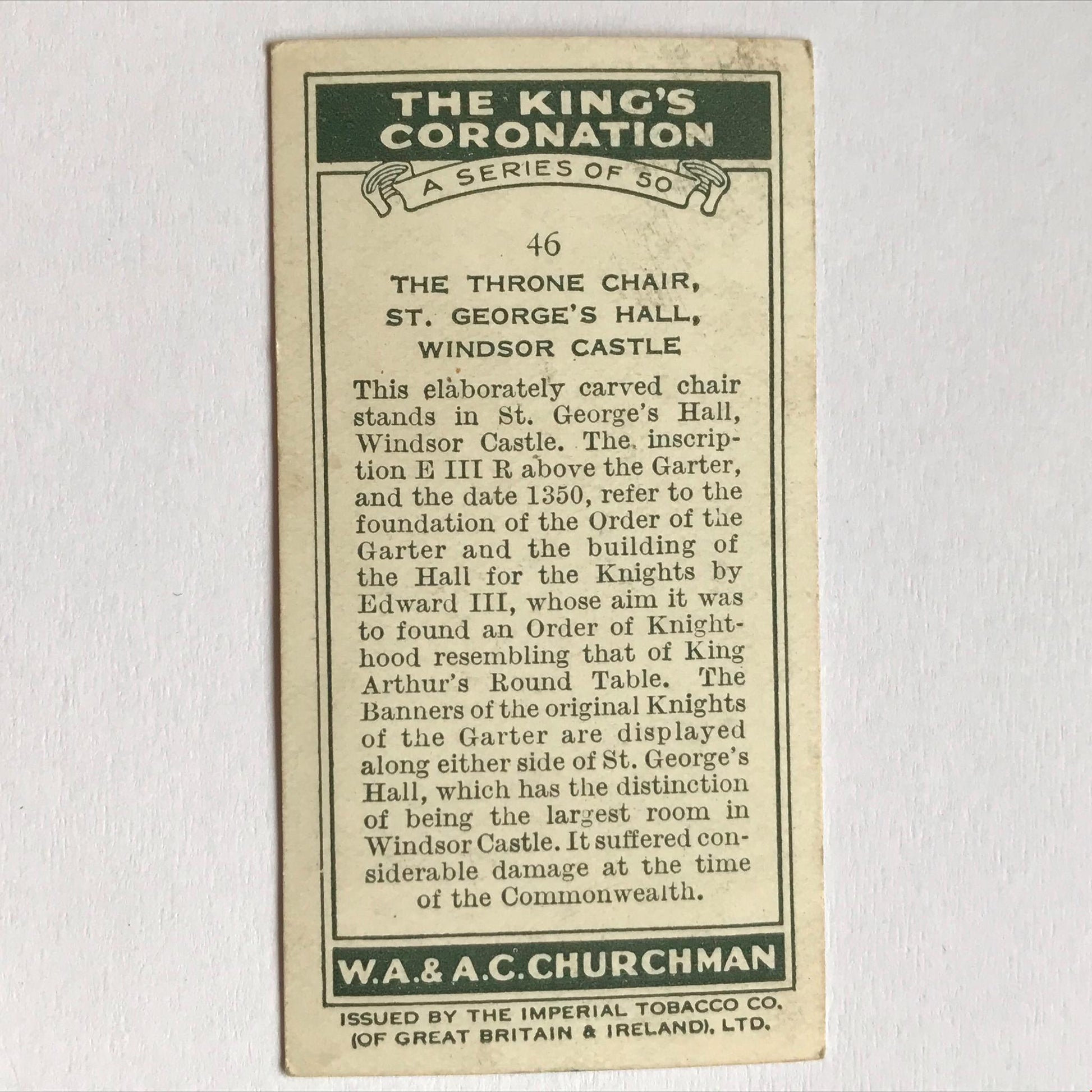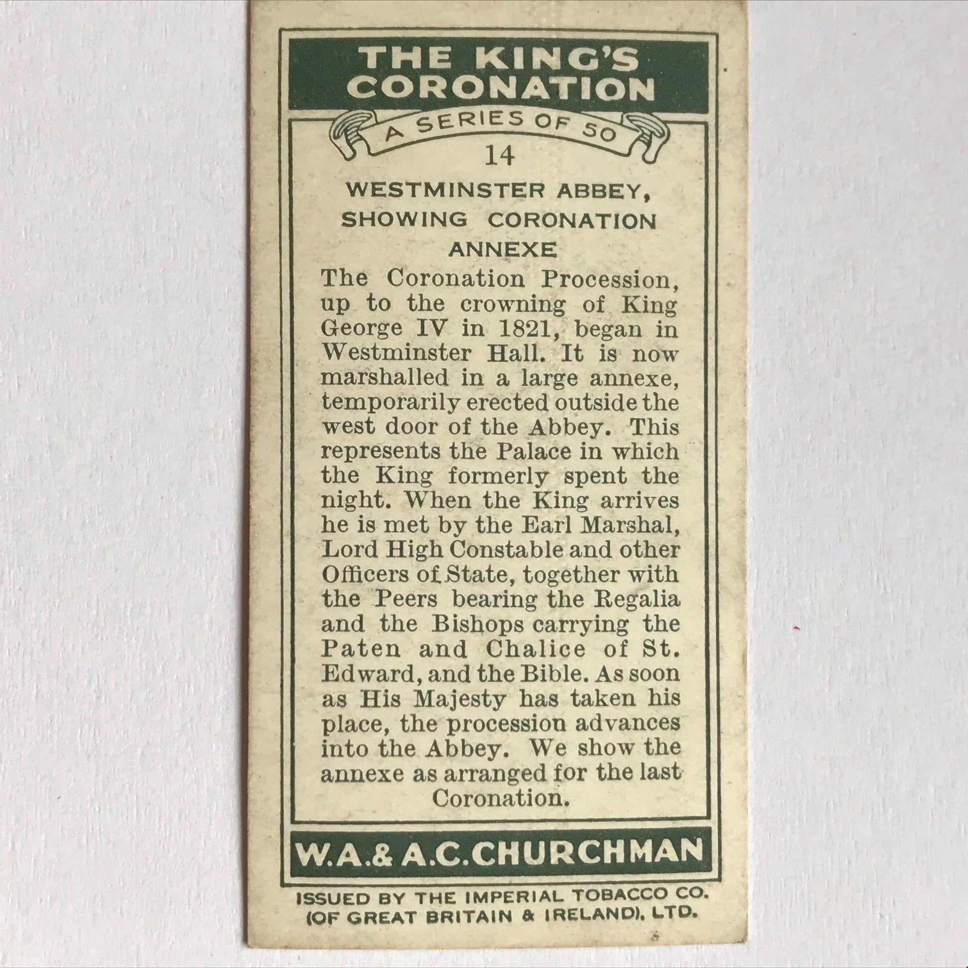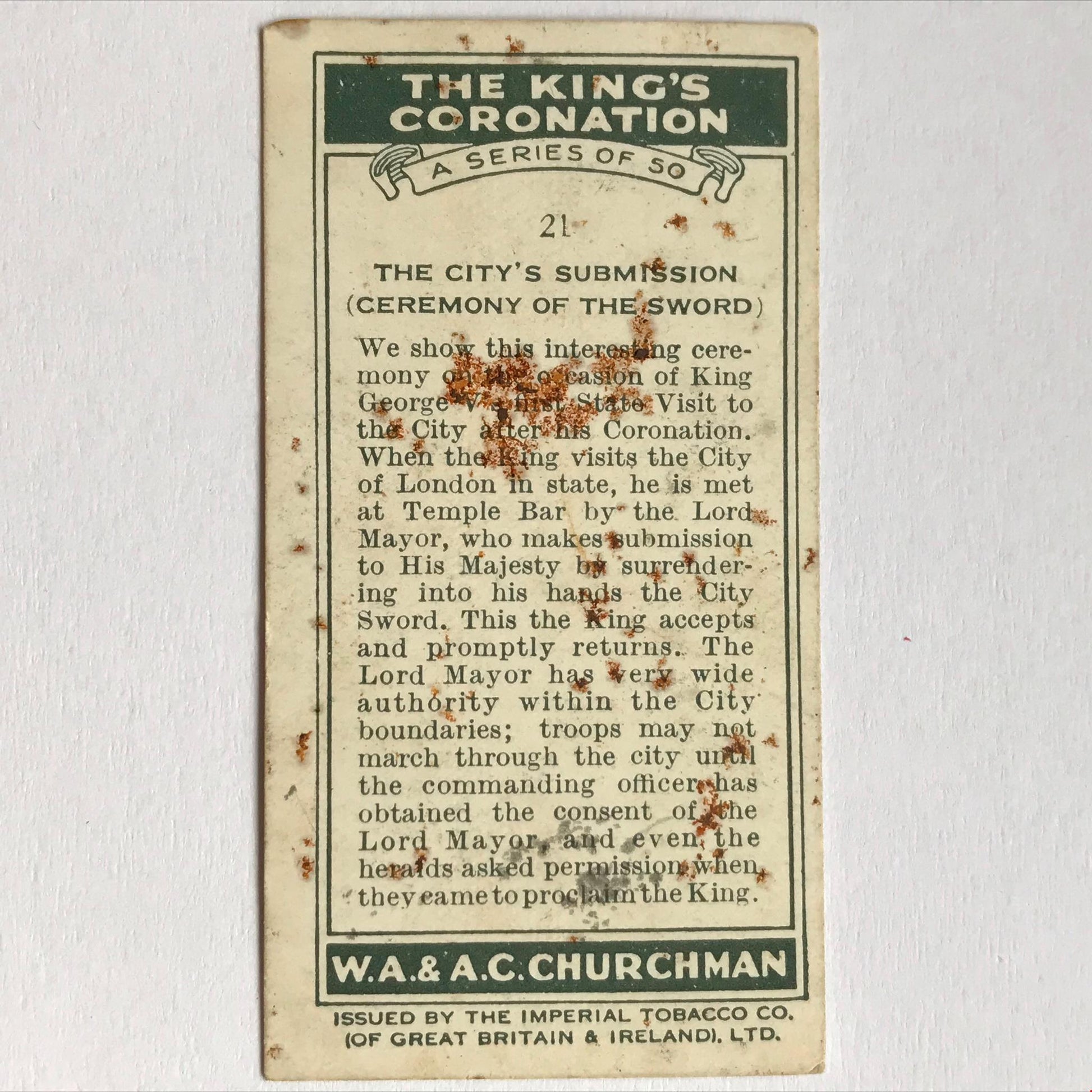 In 1937, W.A. & A.C. Churchman, a prominent British tobacco company, released a series of 50 cigarette cards titled "The King's Coronation" to commemorate the crowning of King George VI. Each card in this collection features detailed illustrations related to the coronation ceremony, providing insights into the event's significance and the traditions of the British monarchy. The reverse side of each card offers informative descriptions, enhancing their educational value.