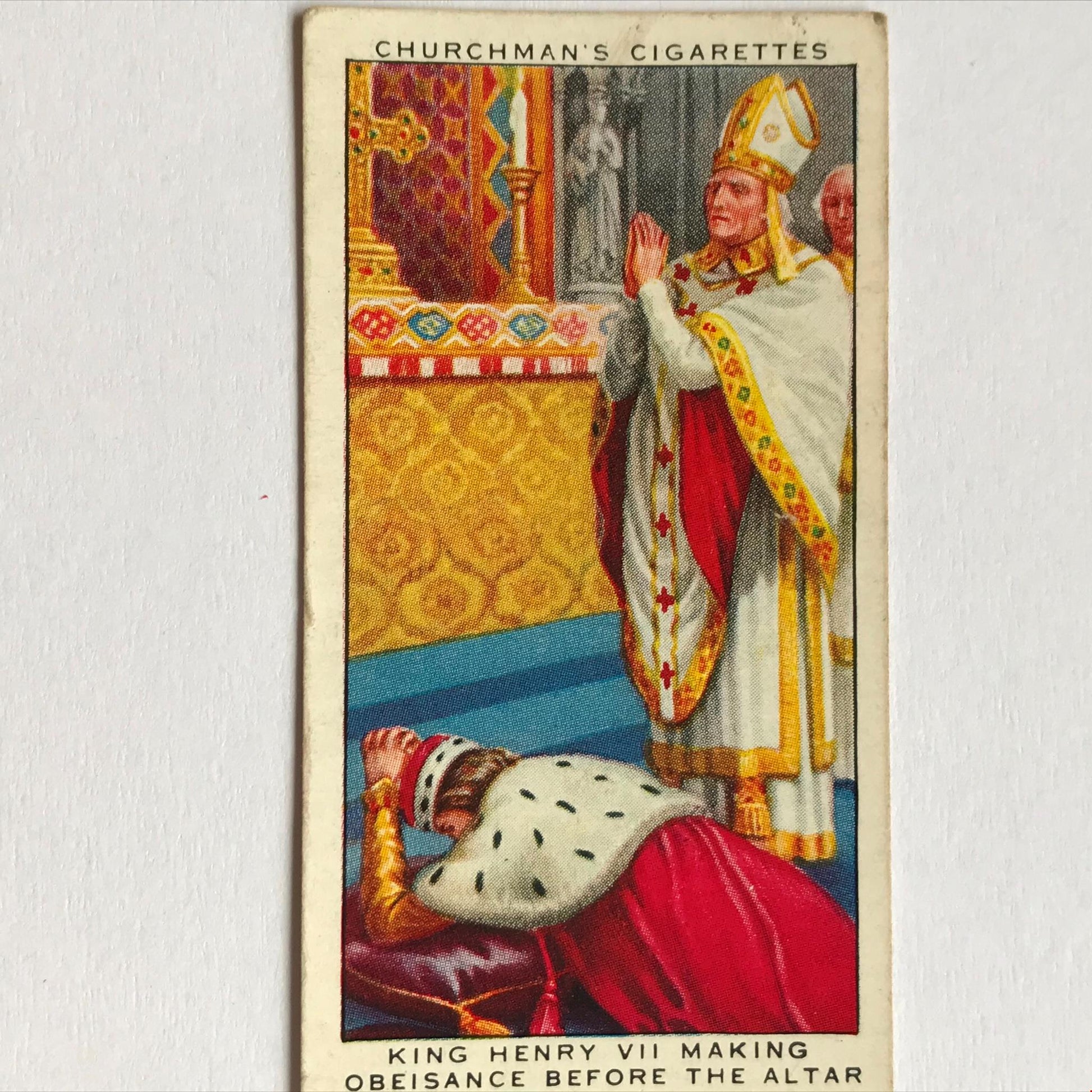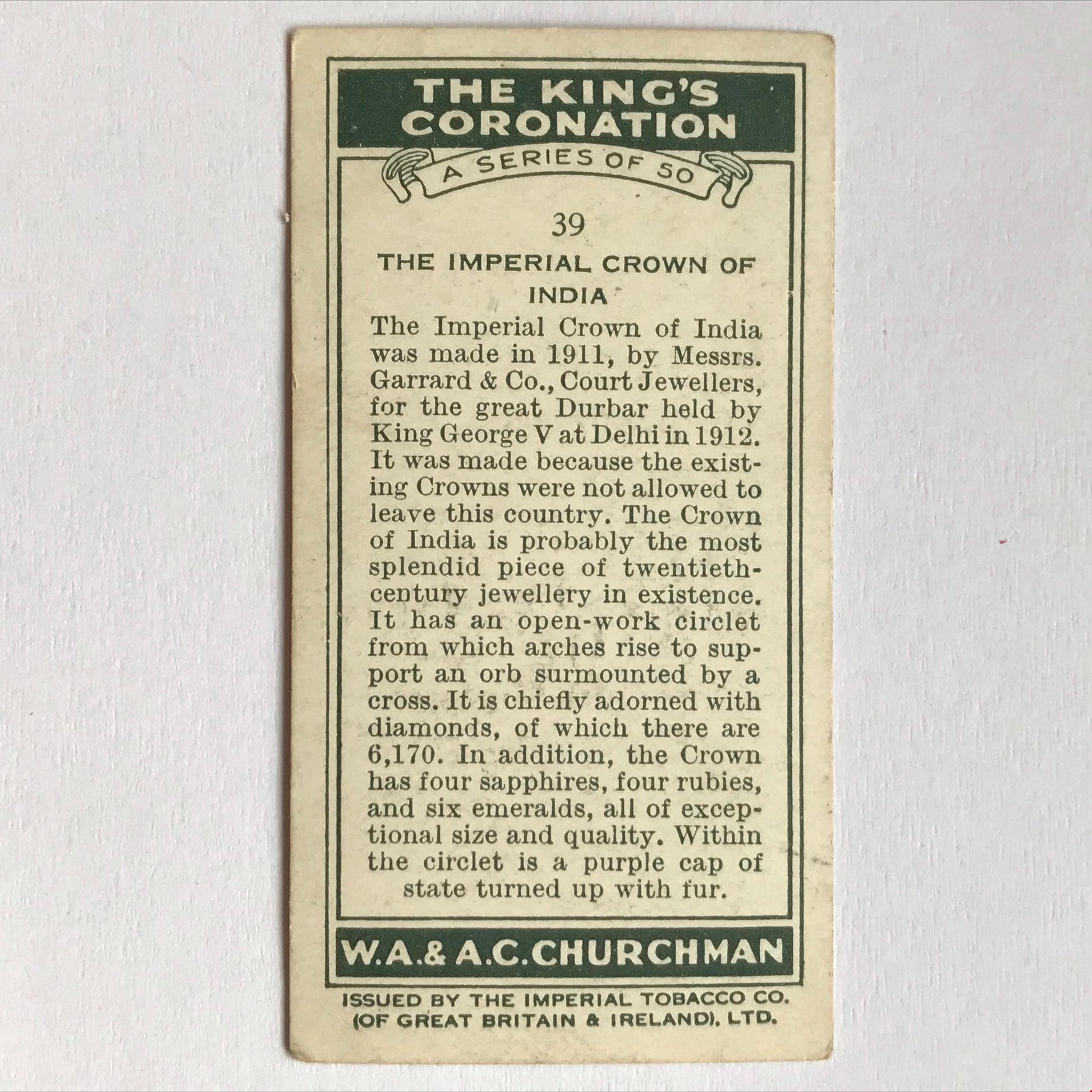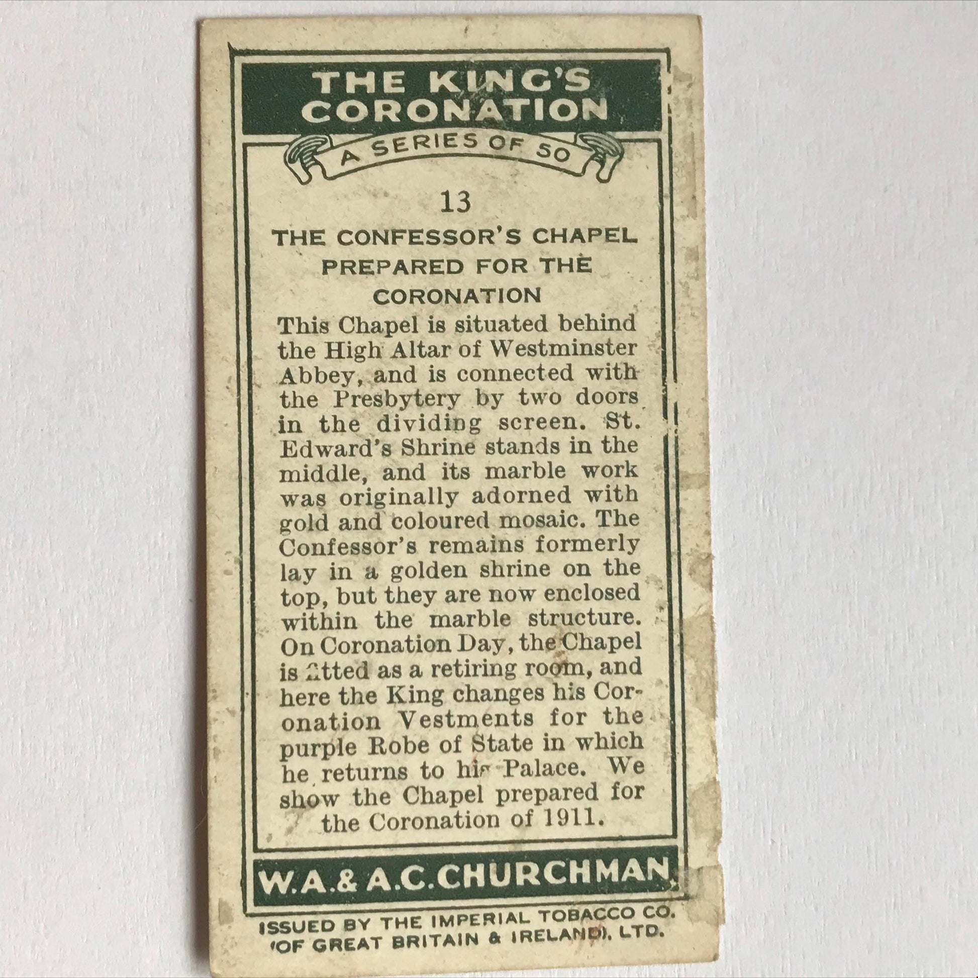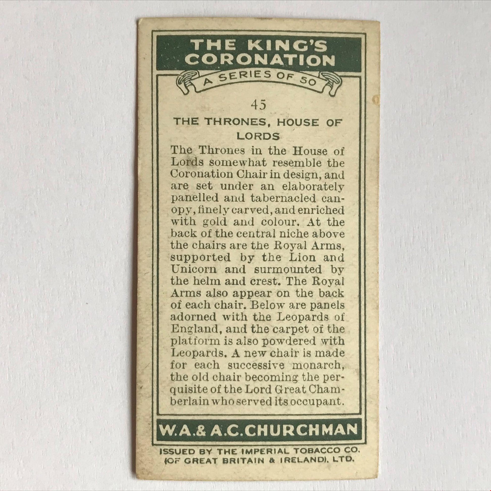 In 1937, W.A. & A.C. Churchman, a prominent British tobacco company, released a series of 50 cigarette cards titled "The King's Coronation" to commemorate the crowning of King George VI. Each card in this collection features detailed illustrations related to the coronation ceremony, providing insights into the event's significance and the traditions of the British monarchy. The reverse side of each card offers informative descriptions, enhancing their educational value.