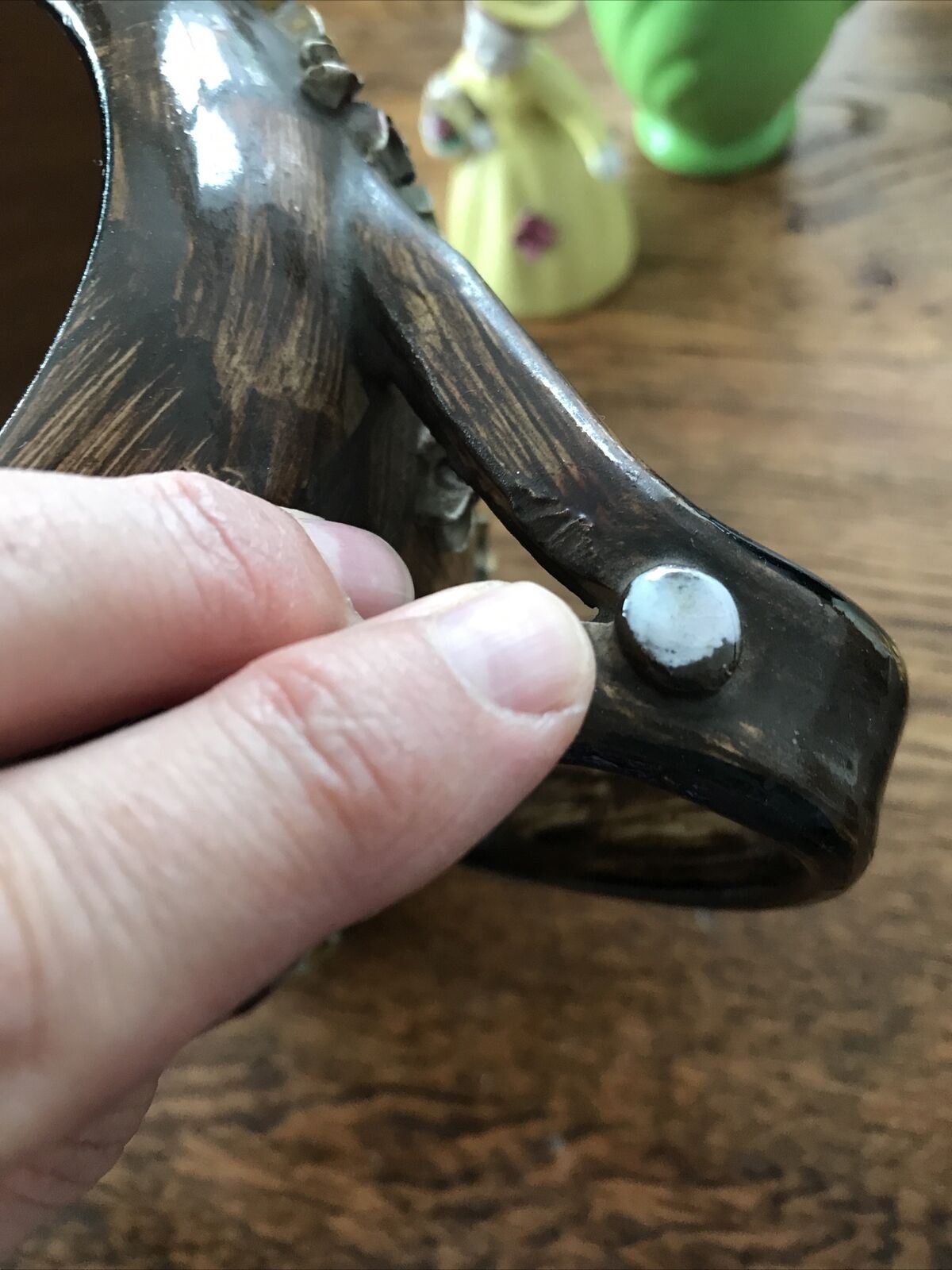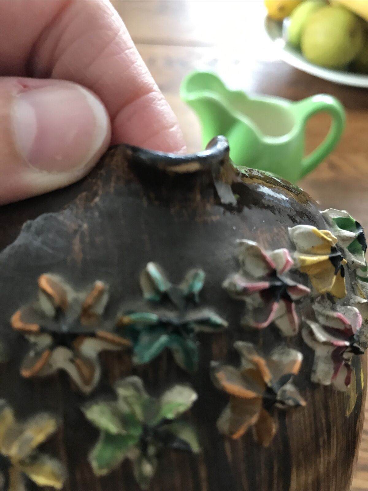 There is a gem missing from the handle and a very slight chip under the spout. Please see photos.