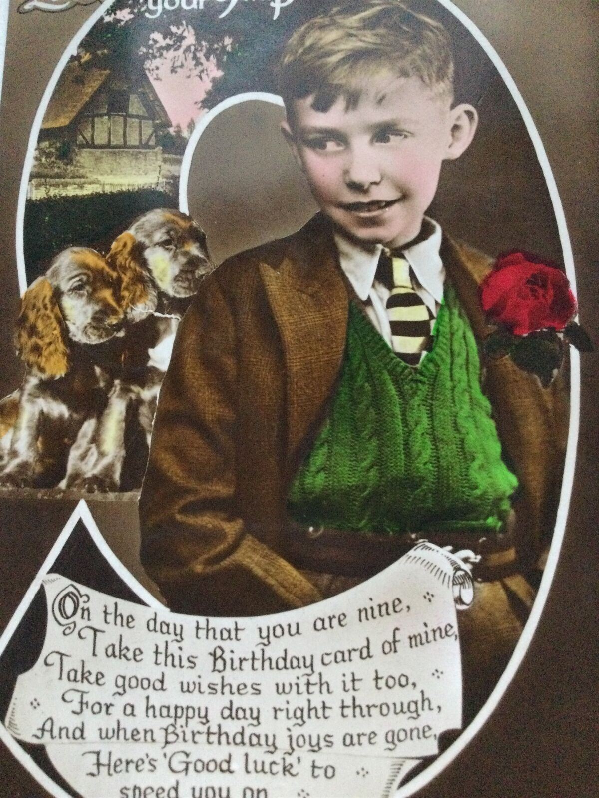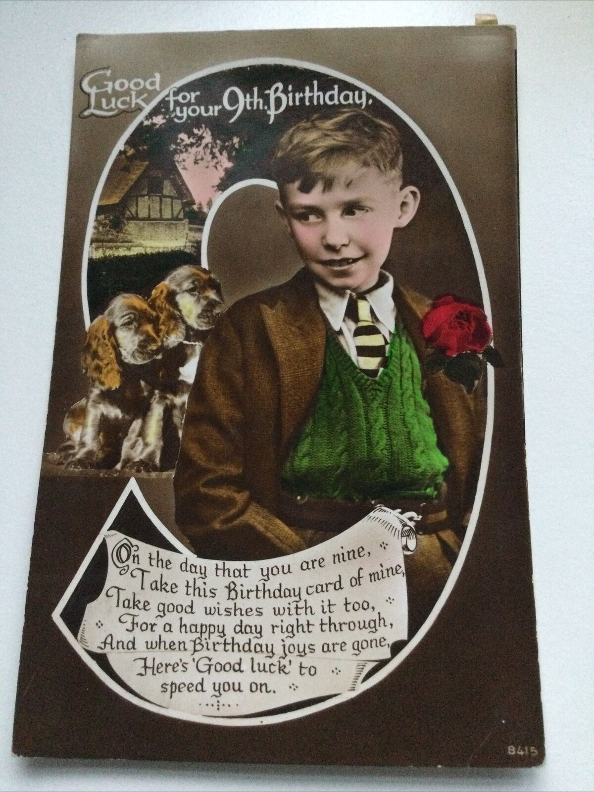 Vintage 9th BIRTHDAY GREETINGS POSTCARD Boy In School Uniform Spaniels Dogs 1937.