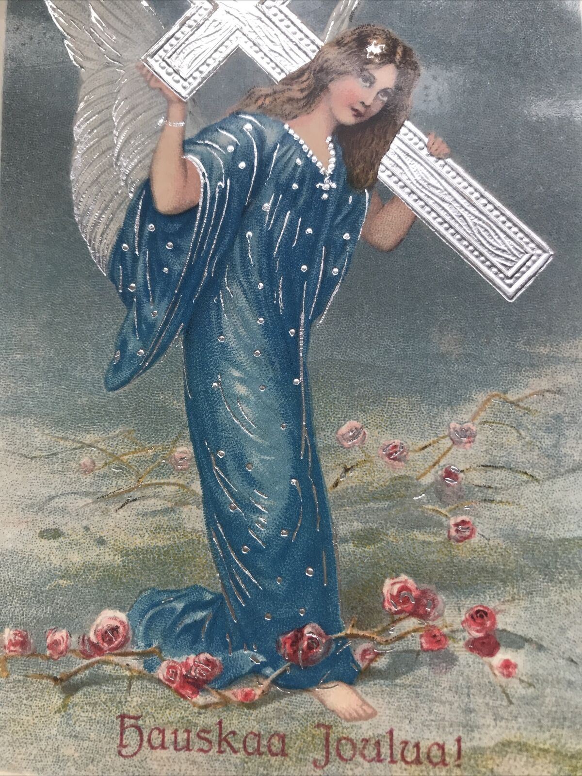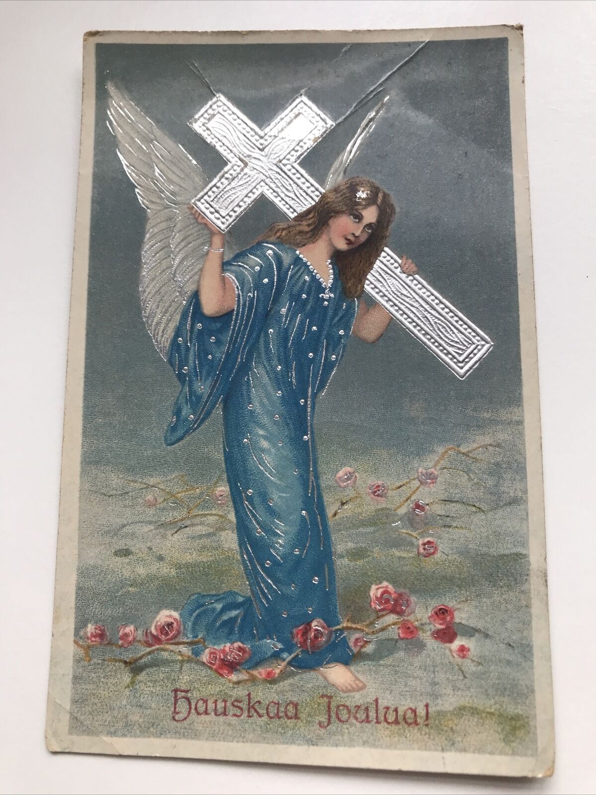 Vintage CHRISTMAS postcard FINNISH FINLAND HAUSKAA JOULUA Angel Carrying Cross.