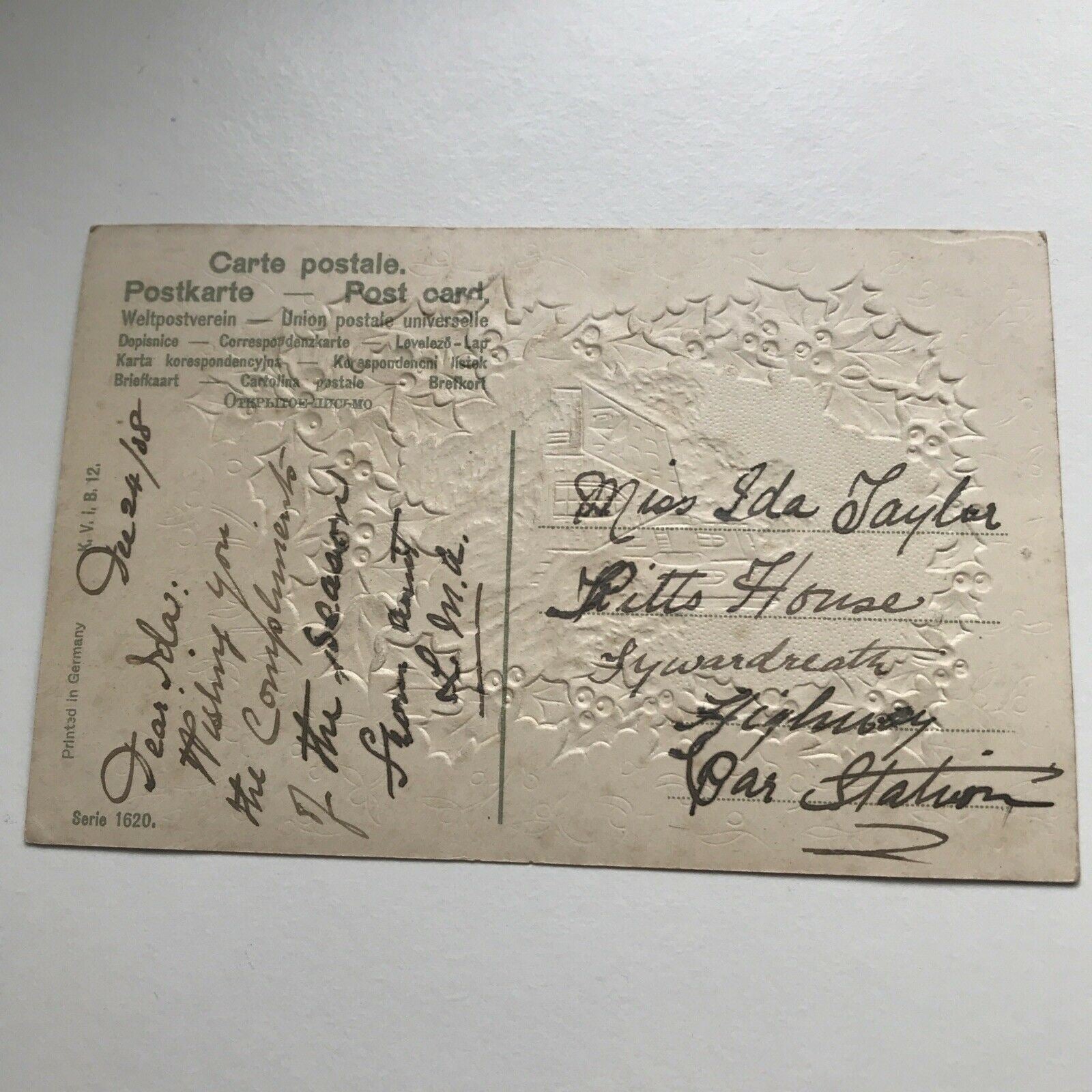 Vintage Embossed Christmas Postcard Church In Snow Holly & Mistletoe Retro.