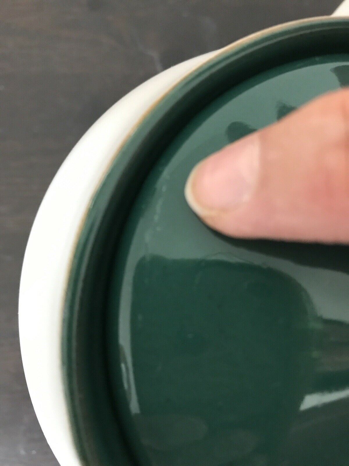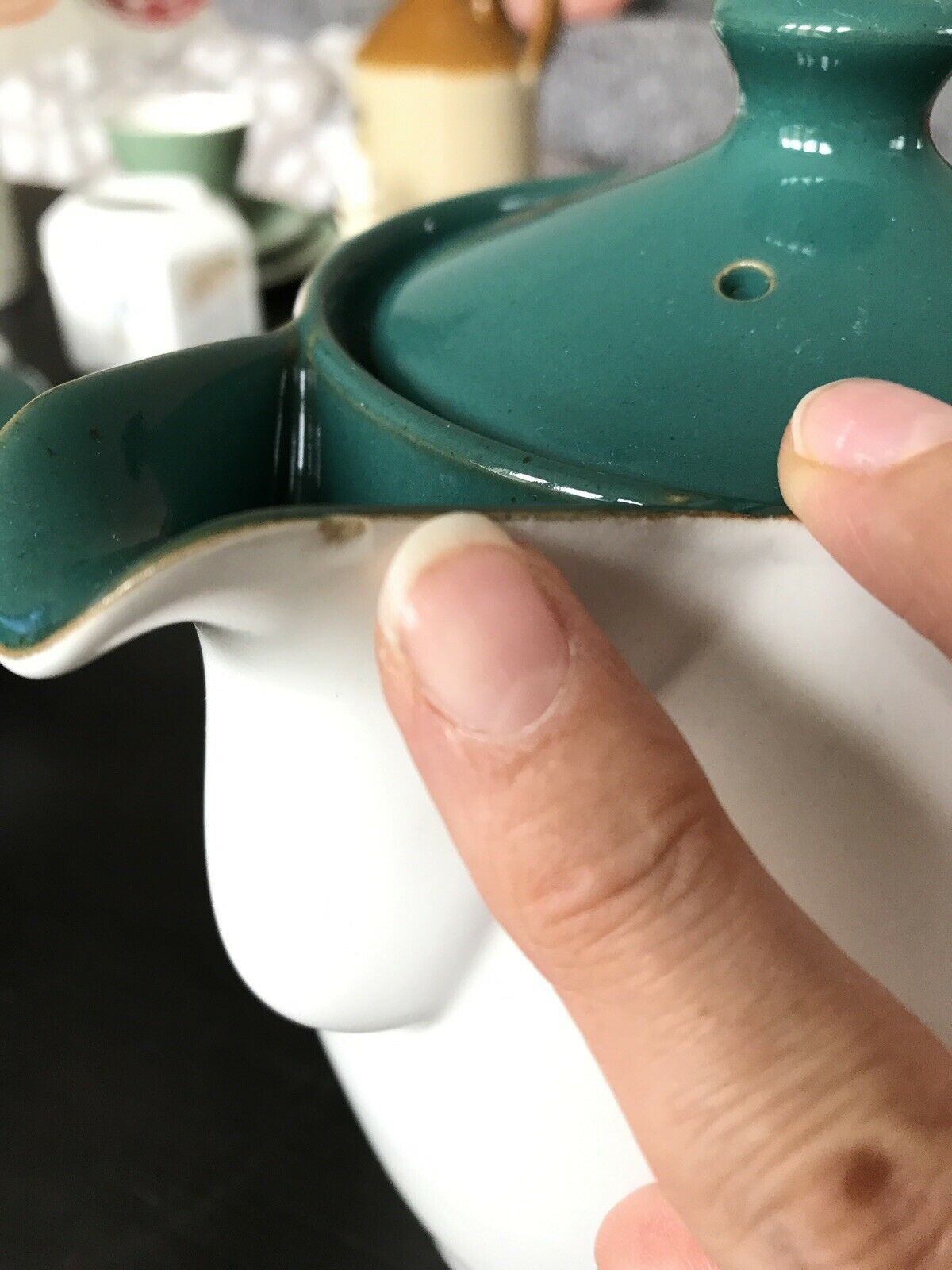 Please take a good look at the photos, there is a small chip, and a mark in the lid glaze.