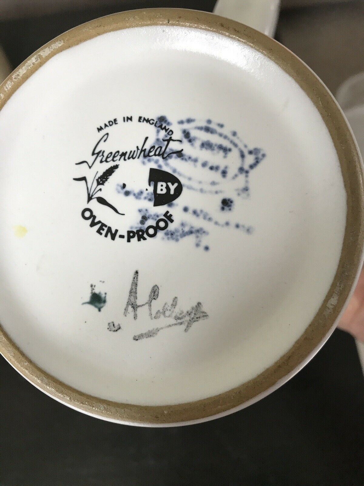 Due to the longevity of production there is a huge variety of pieces to collect with minor variations in design over the years. It features a wheat sheaf hand-painted design on a white "egg-shell" glazed base, with complimentary high glazed green lids, saucers and bases. Some pieces also came with teak stands.