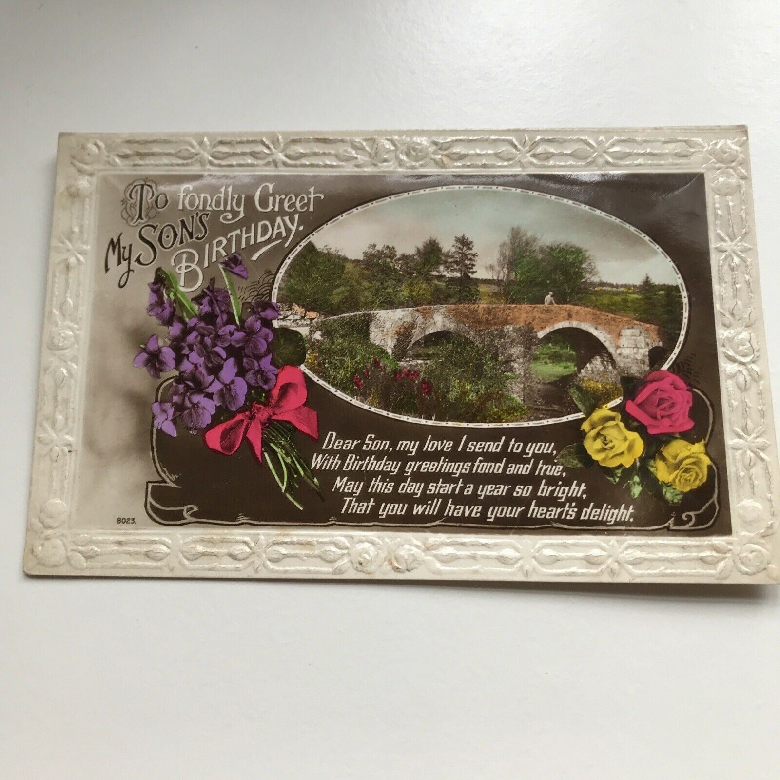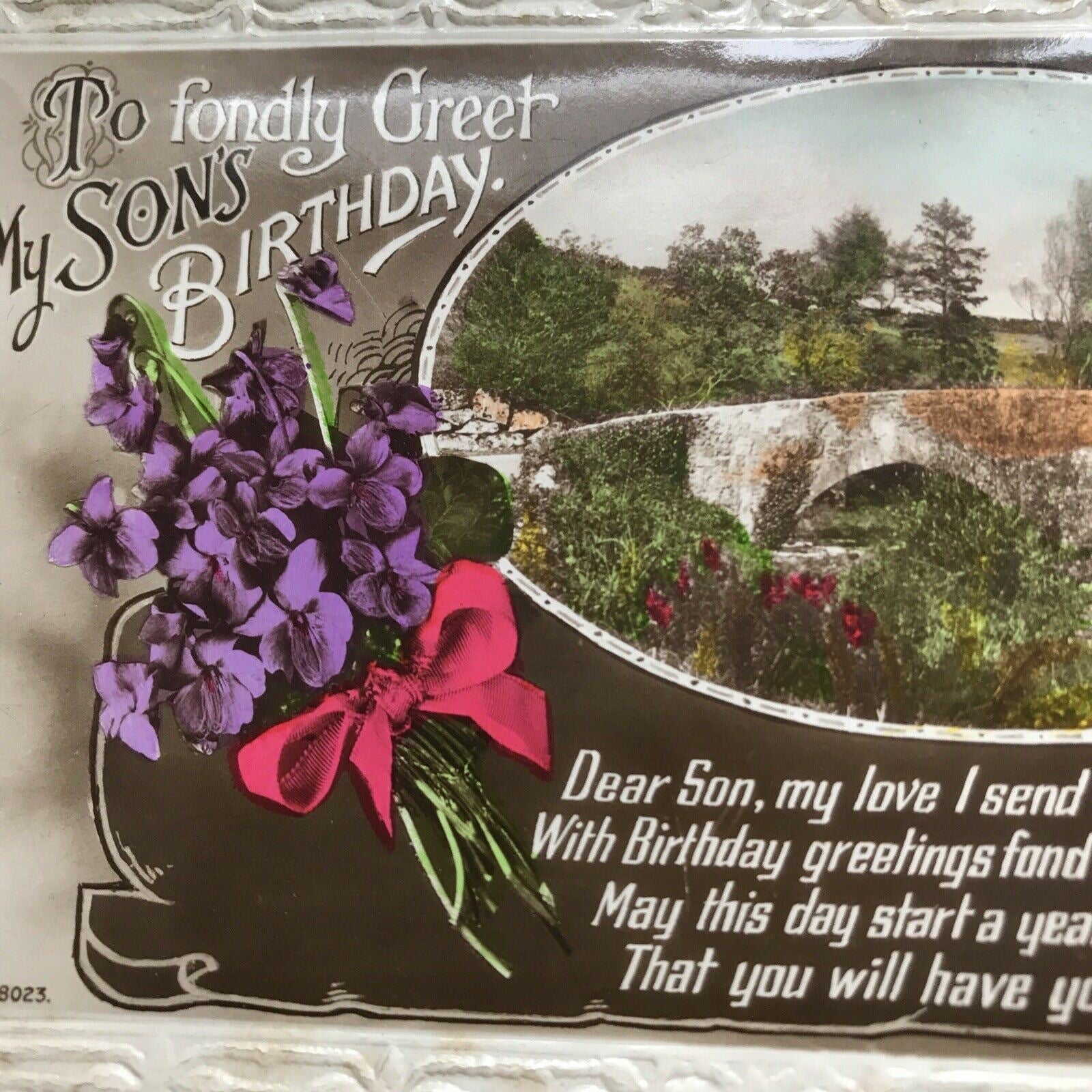 Vintage Or Antique Greetings Postcard SON’S BIRTHDAY. Bridge Violets Roses Poem