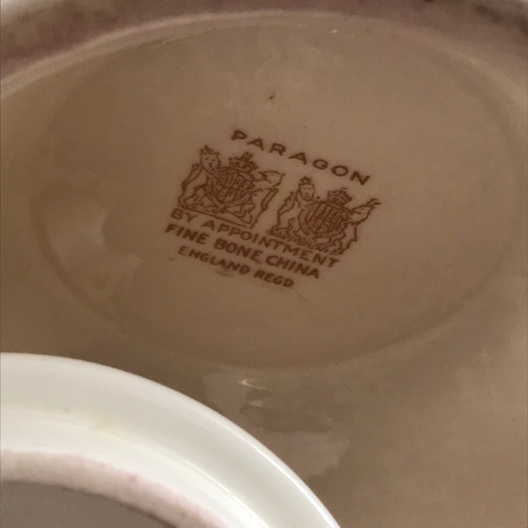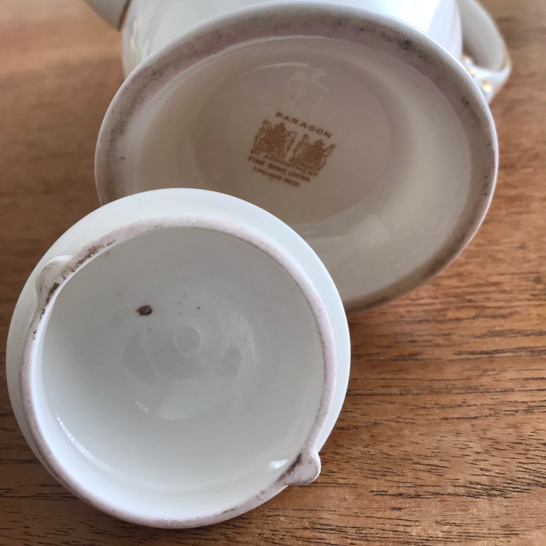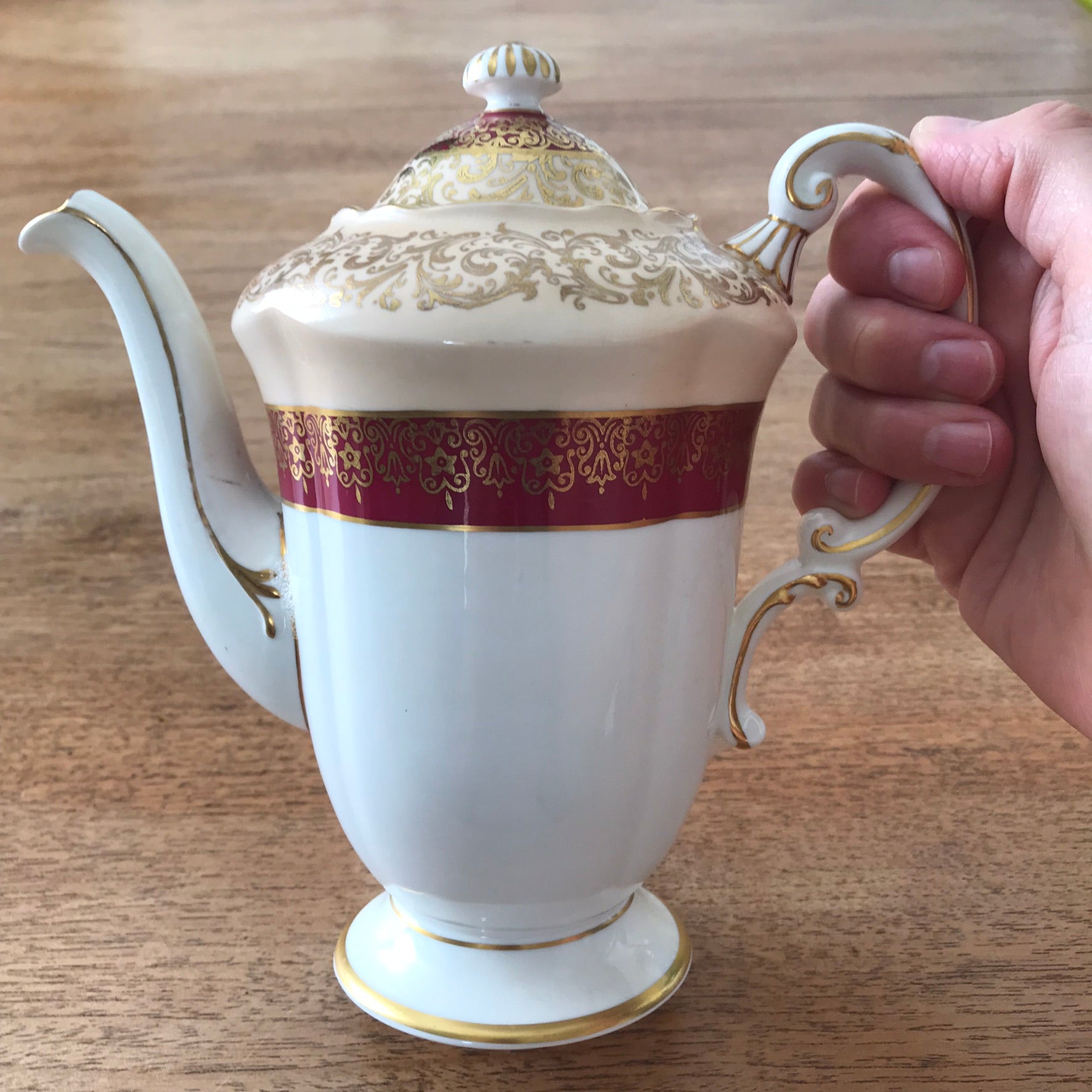 Vintage Paragon coffee pot. White, cream, burgundy and gold. Ornate design. Fancy handle and spout.