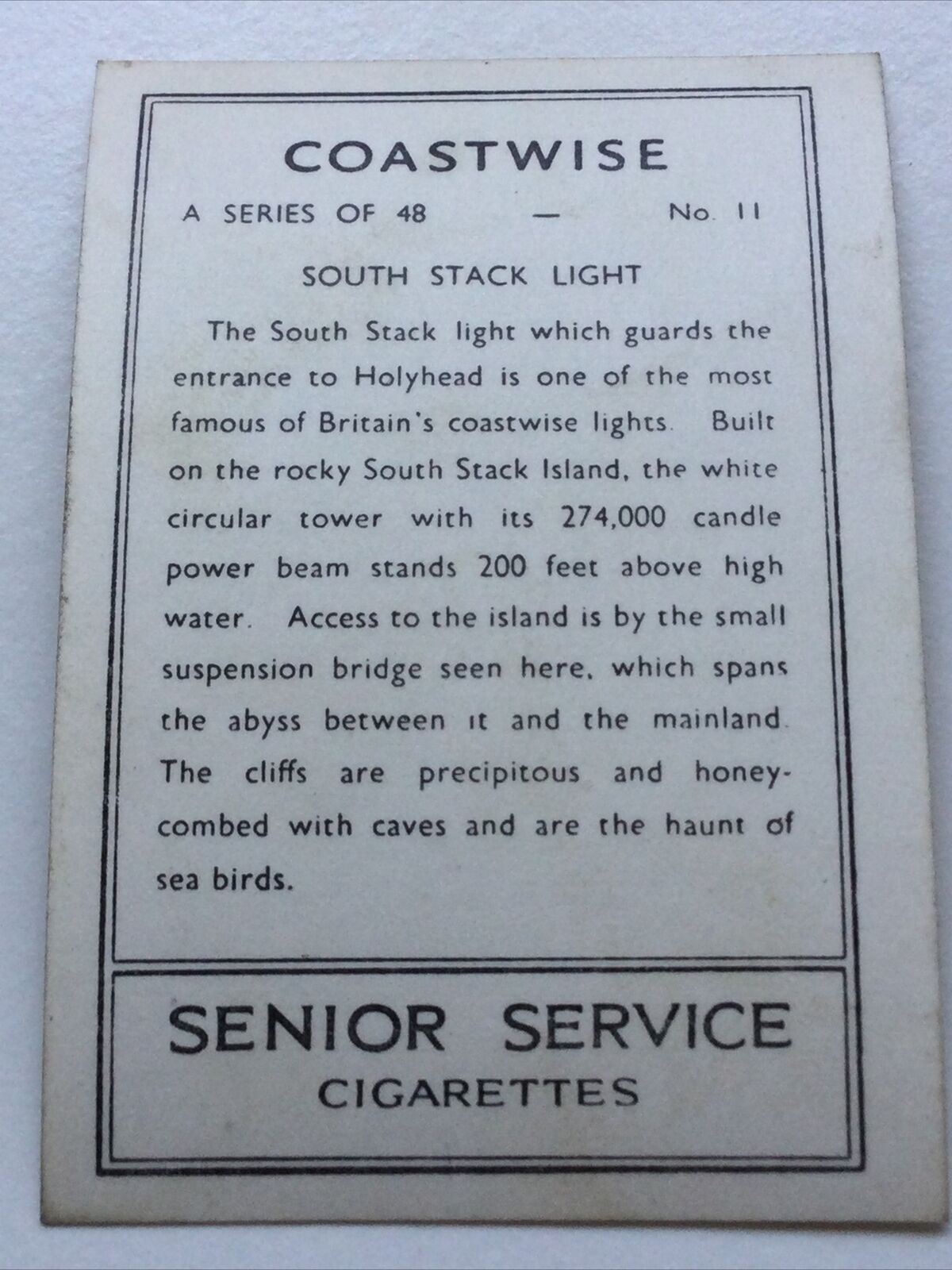 Vintage Cigarette Card - 1939 1930s - Senior Service - COASTWISE - No. 11 - SOUTH STACK LIGHT - lighthouse