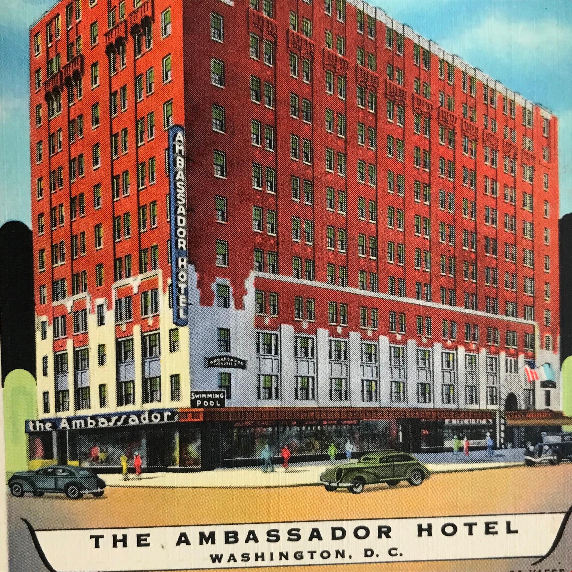 The Ambassador Hotel, located on the southwest corner of 14th and K Streets NW across from Franklin Square, was a showcase of modern amenities and conveniences when it opened in September 1929. It was the work of successful developer Morris Cafritz (1890-1964), who lived at the hotel for a number of years and had his offices there. An important and distinctive DC landmark, the Ambassador nevertheless didn't aim for the heights of refinement and elegance embodied in, say, the Willard or the Mayflower. Instead it was designed for the common man, advertising itself as the "stopping place of experienced travelers." (from Wikipedia)