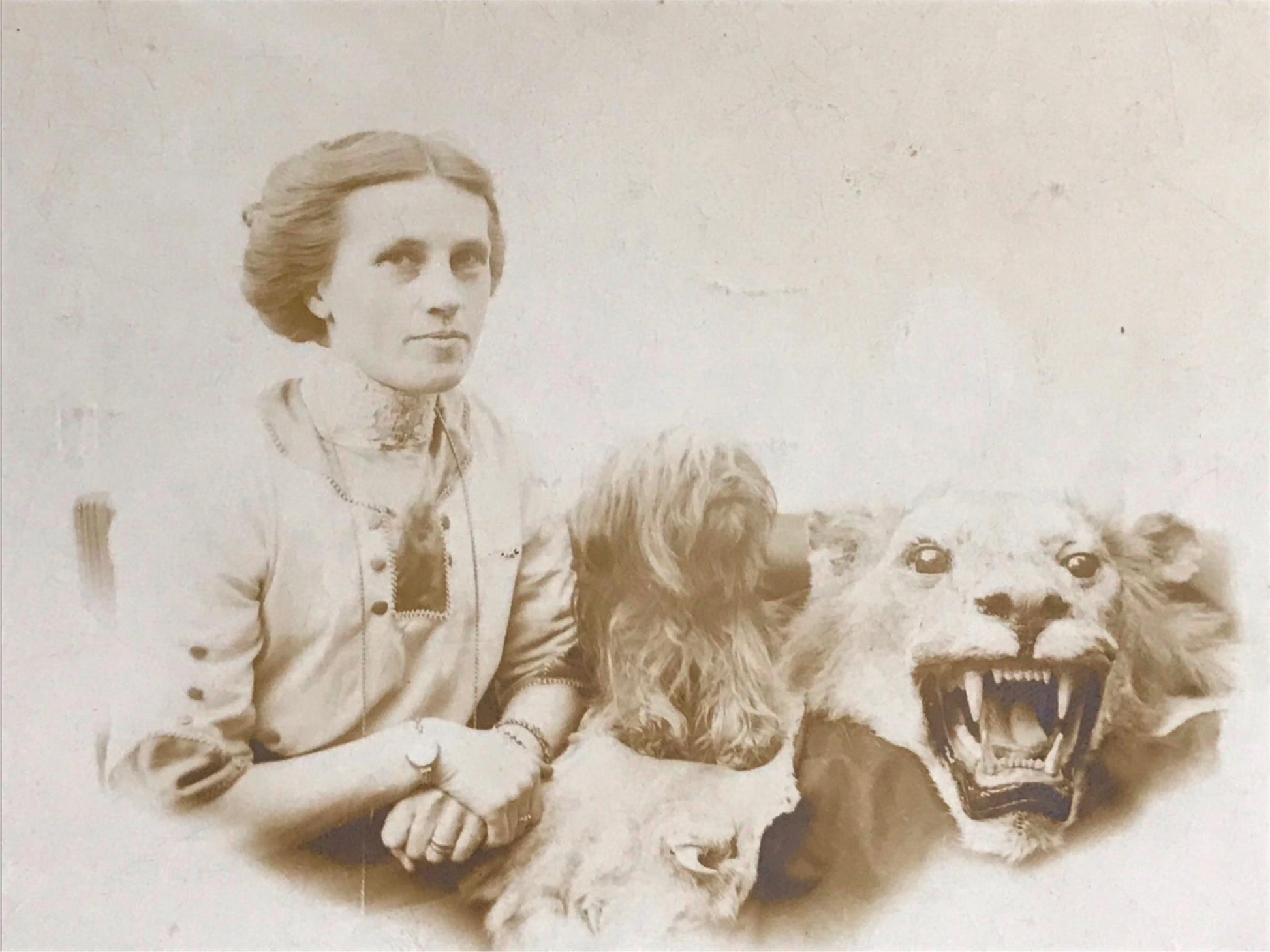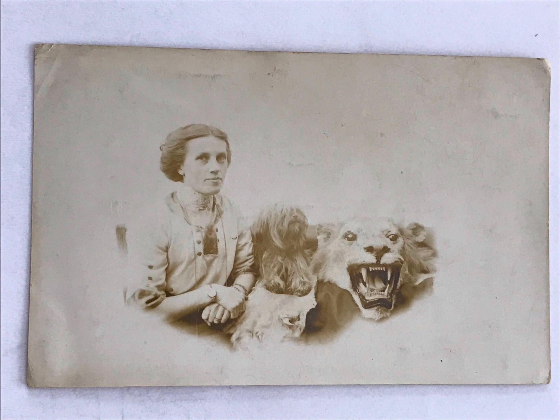 Vintage postcard SOCIAL HISTORY PHOTO WOMAN WITH SCRUFFY DOG ON LION RUG sepia