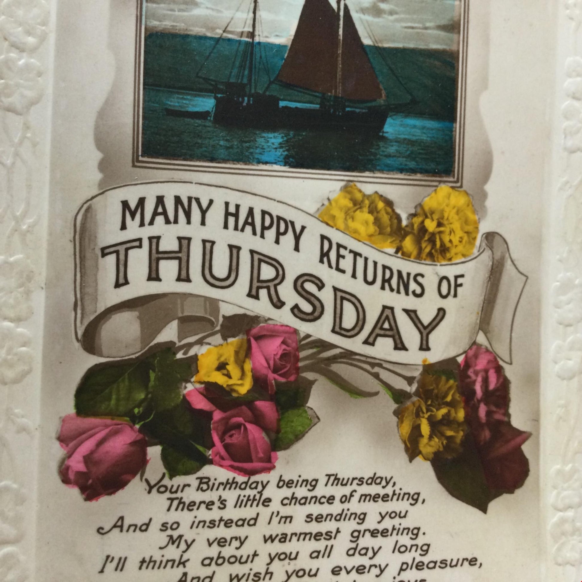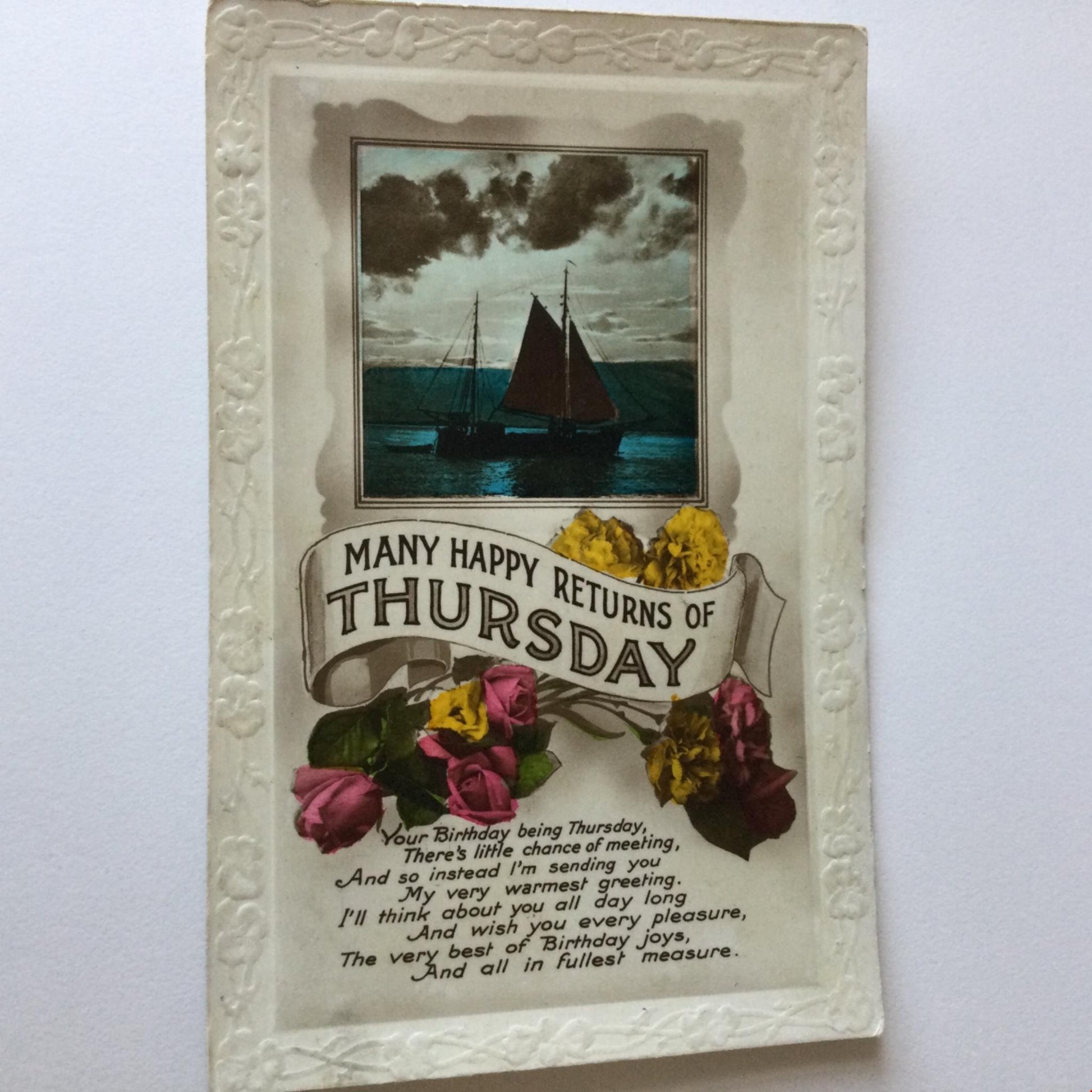 Vintage THURSDAY BIRTHDAY Greetings Postcard colourful flowers boat yacht poem