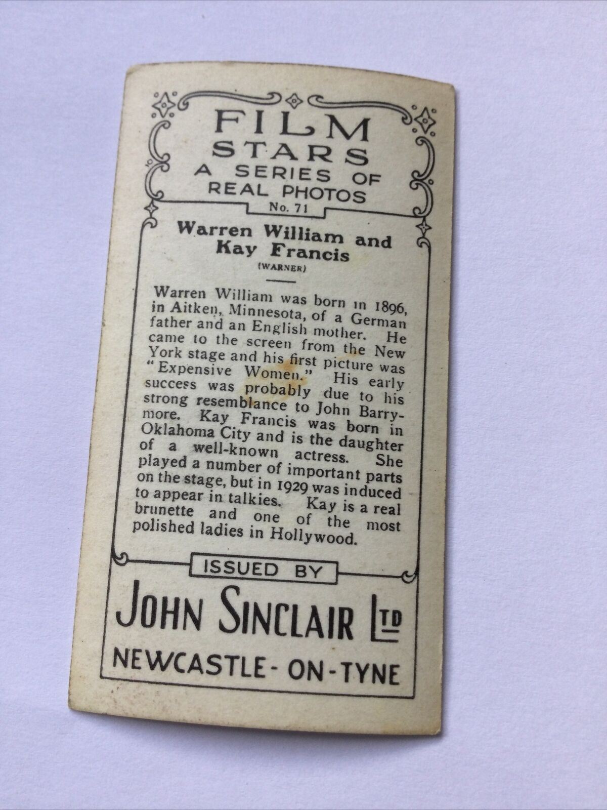 WARREN WILLIAM KAY FRANCIS Photo - John Sinclair Cigarette Card Film Stars #71