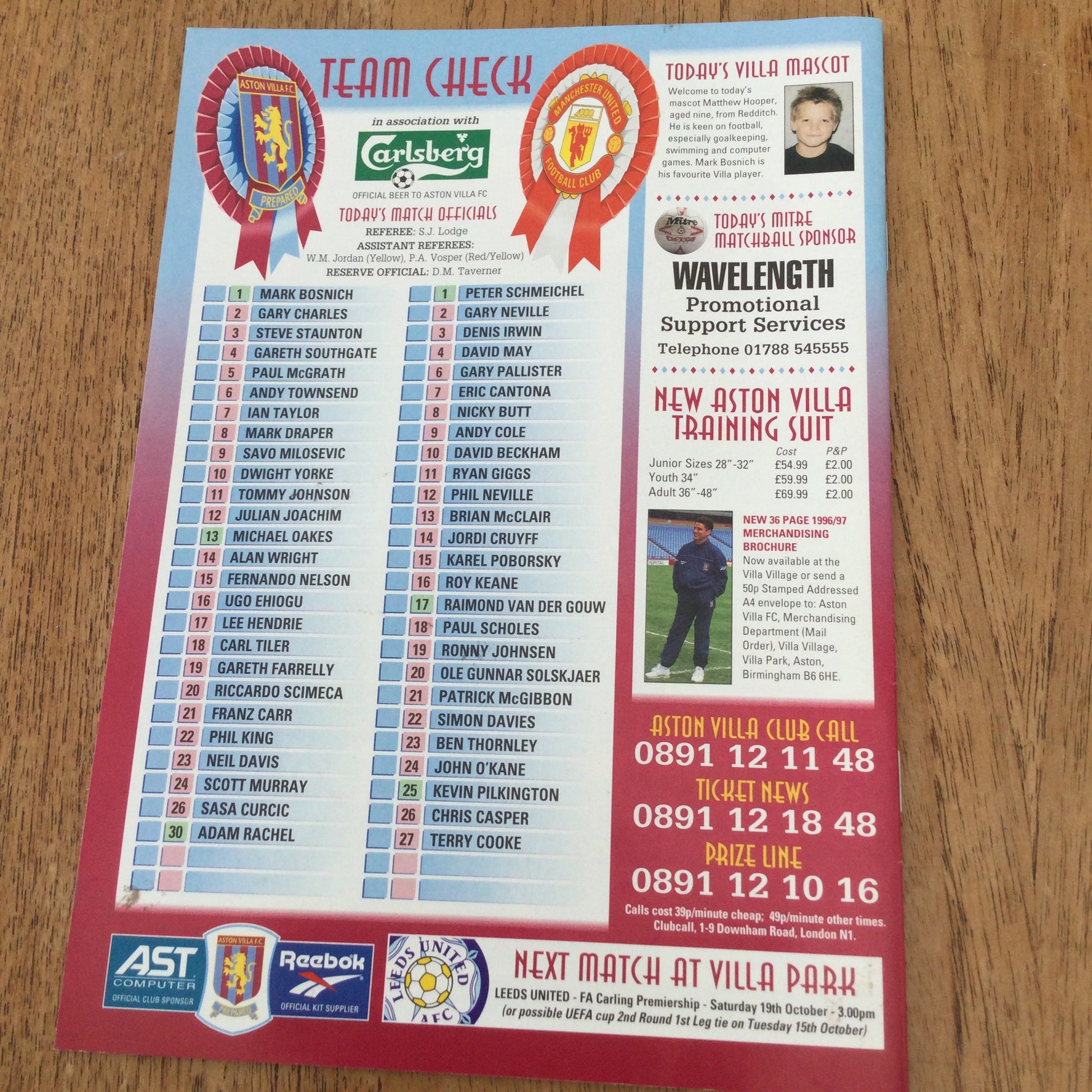 Aston Villa v Manchester Utd Football Programme 1996 21/9/86. Spotlight on Sasa Curcic. Mascot Matthew Hooper.