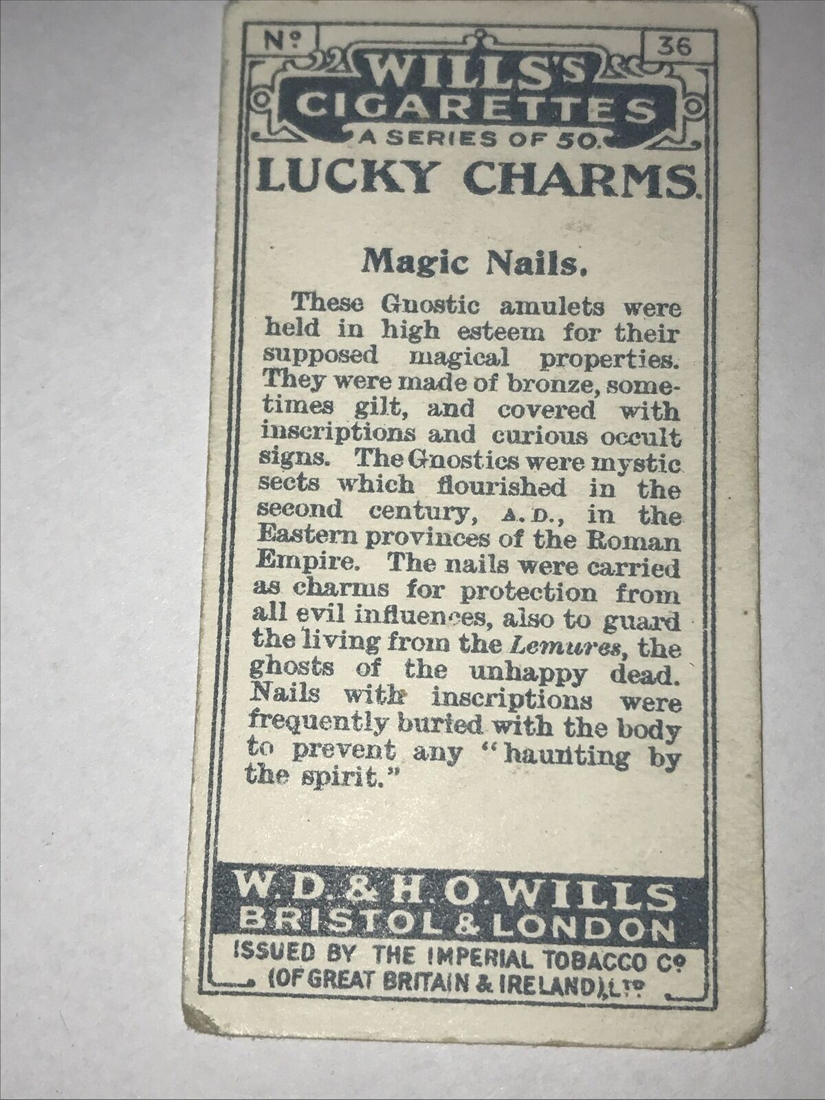 Wills Cigarette Card Lucky Charms no36 Magic Nails. Condition is "Used". Dispatched with Royal Mail 1st Class Letter.